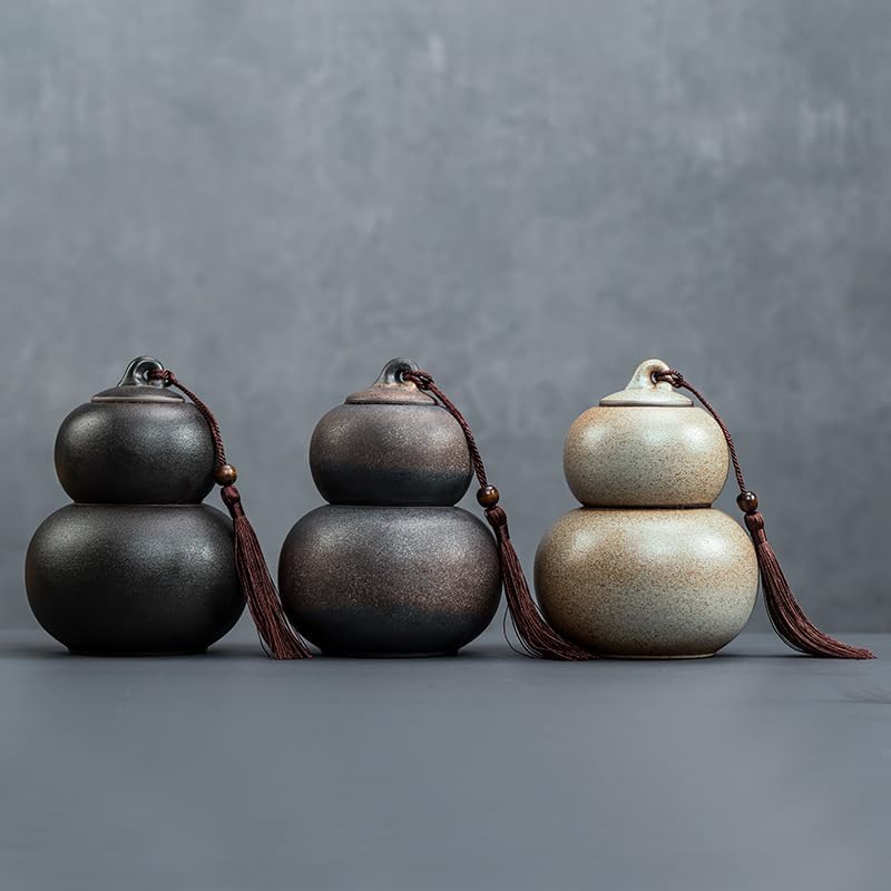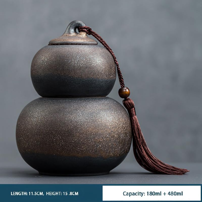 - Exquisite Ceramic Gourd Shap Double -Layer Airtight Storage Jar; Diameter: 4.5" /11.5cm, Height: 6.2" /15.8cm; Below: 16 Oz /480ml, Above: 6 Oz /180ml.