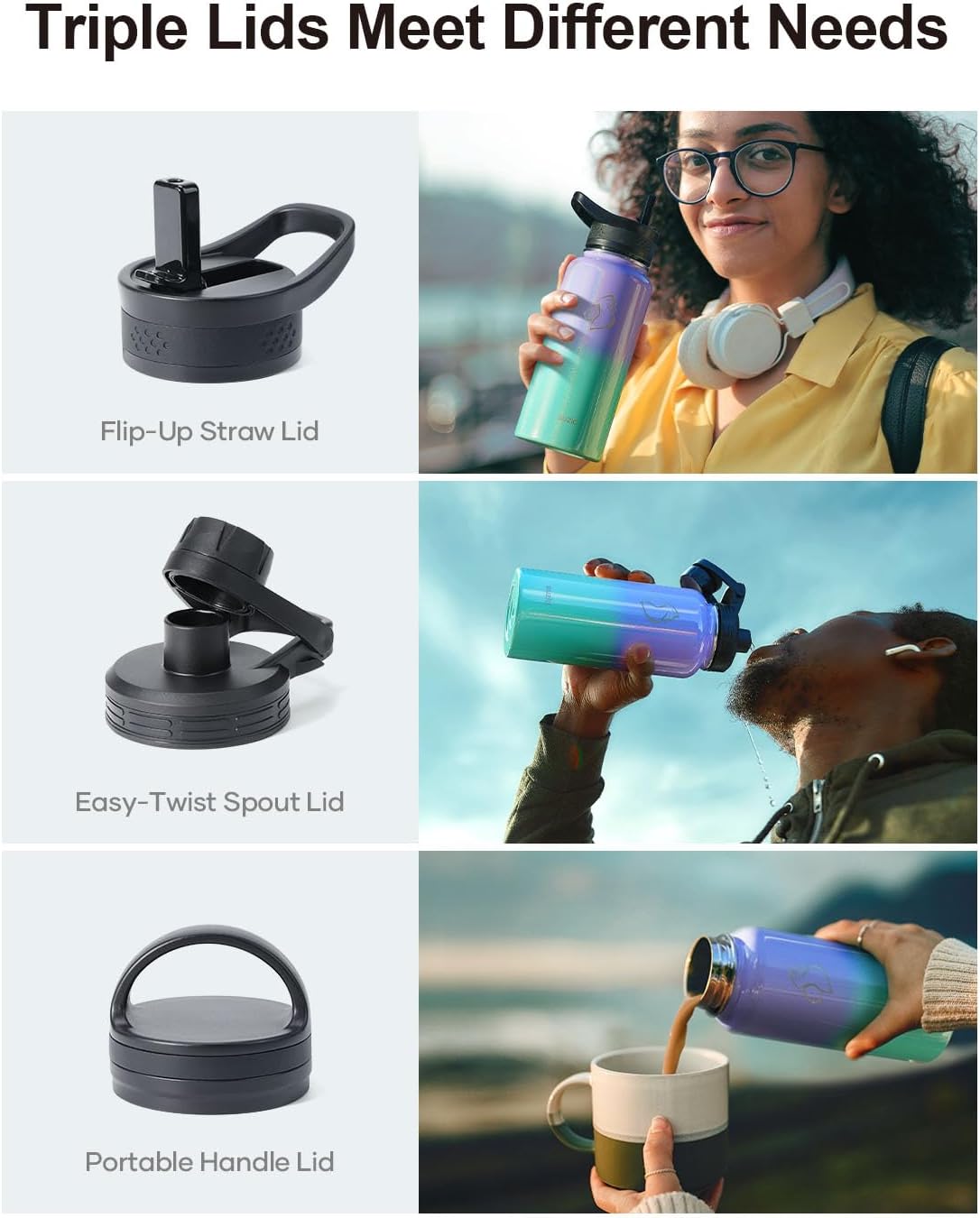 - Super Deal Combo: Buy 32oz insulated water bottle, get 7 accessories. The pack includes 1 x carrying pouch, 3 x lids, 2 x straws, and 1 x straw cleaner. This bottle is ideal for camping, hiking, cycling, running, gym sessions, or outdoor work, ensuring you stay hydrated wherever you go.