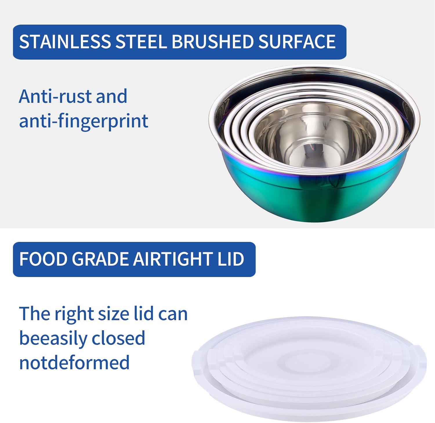 Rainbow Mixing Bowls With Airtight Lids,Stainless Steel Bowl,Salad Bowls 5 Piece Colorful Nesting Bowl Rainbow Kitchen Accessories,Size 5.5,3.6,2.7,2.1,1.5,QT Stackable Design
