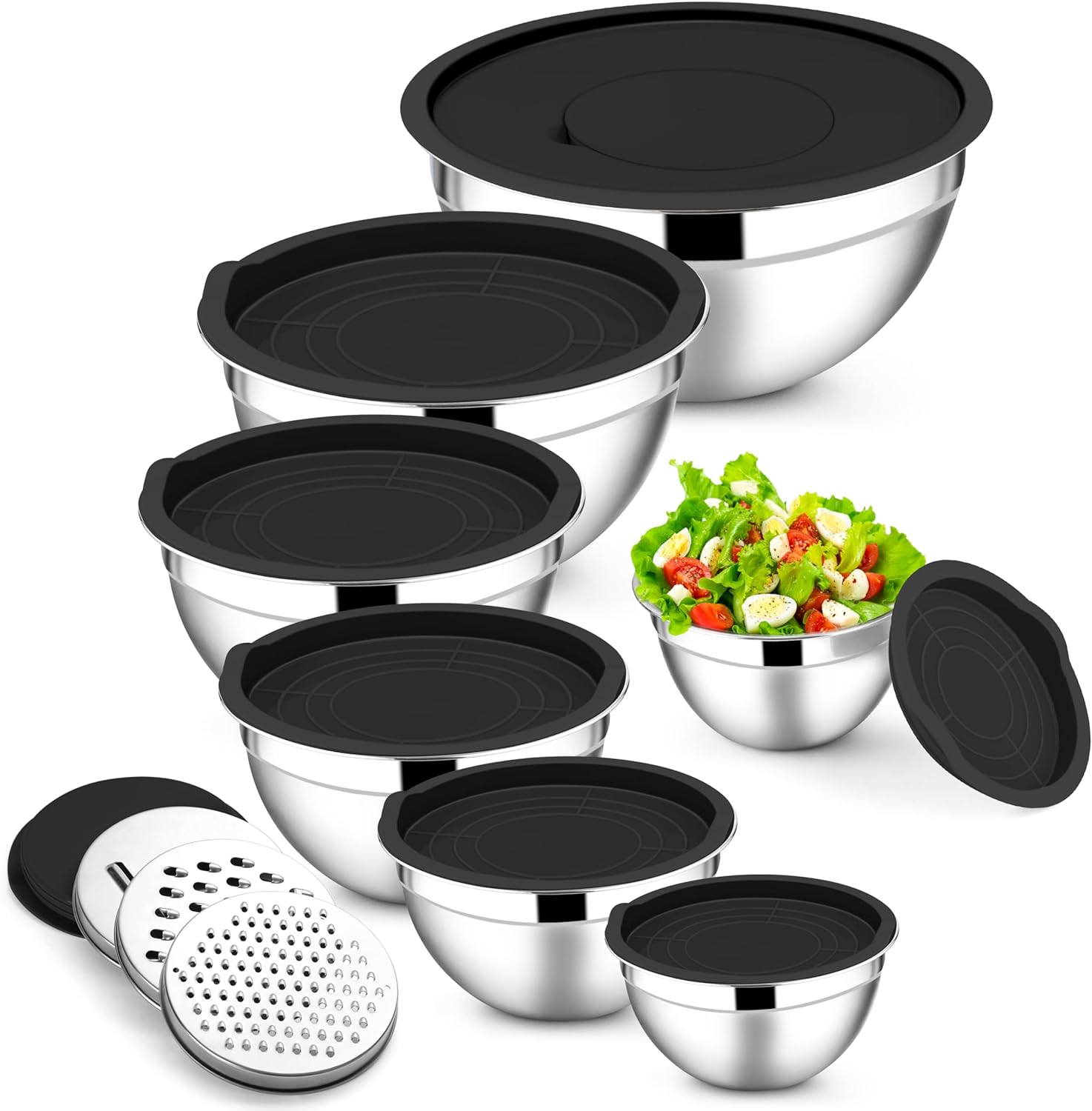 E-far Mixing Bowls with Lids Set, 7-Piece Stainless Steel Metal Mixing Bowls with 3 Grater Attachments, Size 4.6, 3.5, 2.6, 2, 1.5, 1, 0.7QT, Nesting Design & Black Airtight Lids, For Baking/Cooking