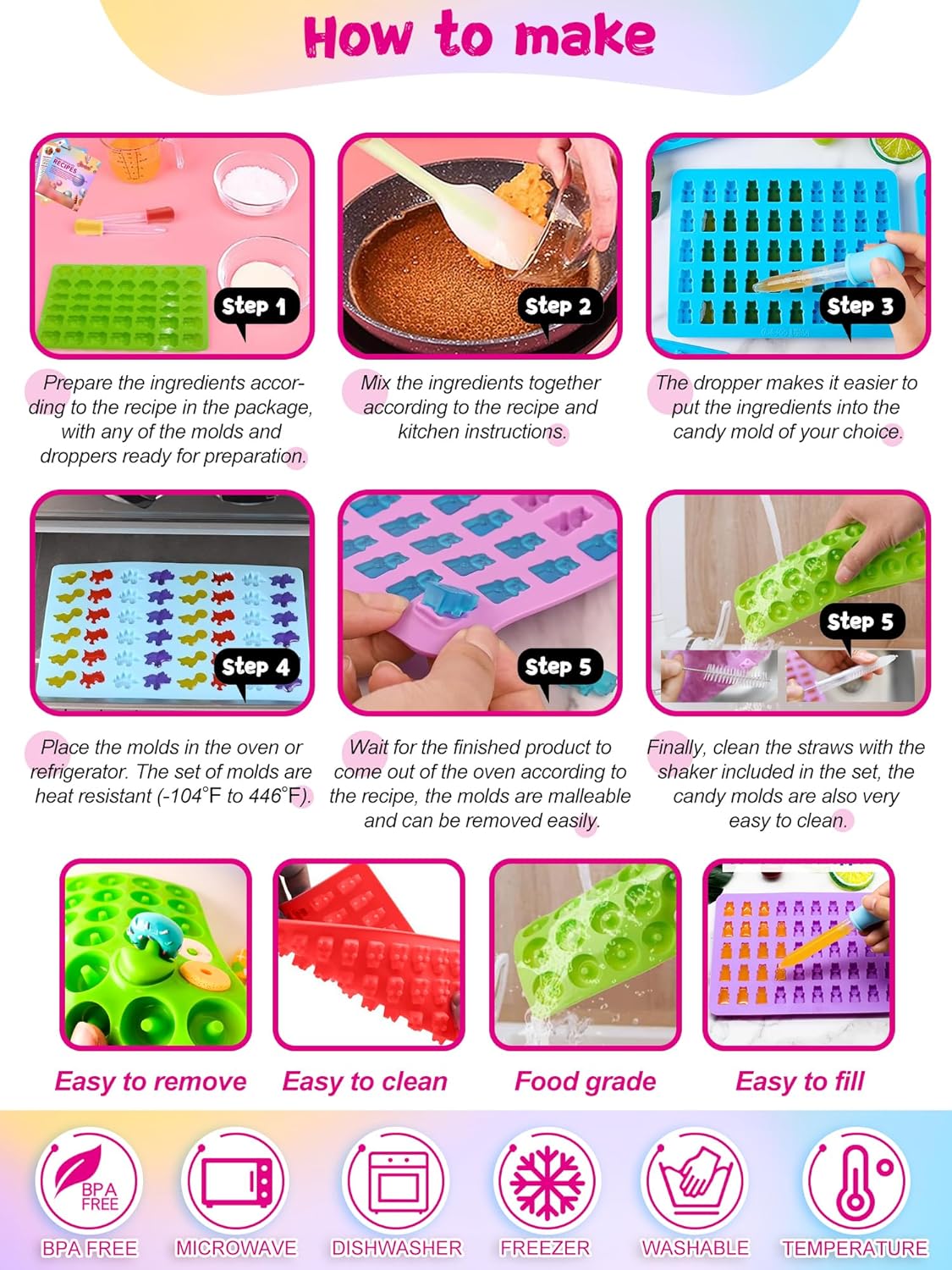 - ✅ "Made of FDA Food Grade Silicone – BPA-Free, Non-Toxic, and Heat-Resistant (-40°F to 446°F), Safe for Kids and Perfect for Chocolate, Gummy Bears, and Ice Cubes!"
