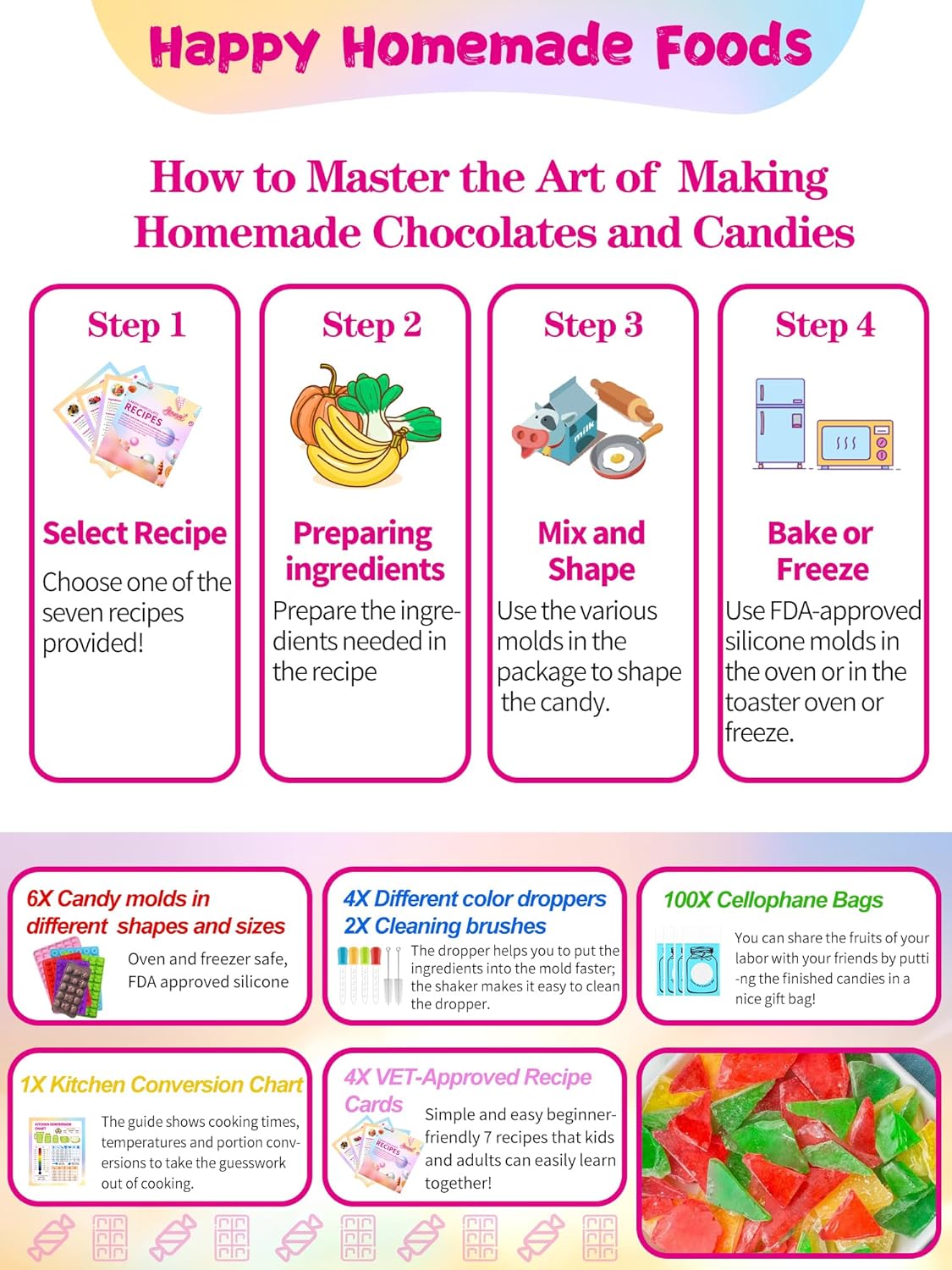 - 💯 "100% Satisfaction Guarantee – If You’re Not Happy with Your DIY Candy Creations, We’ll Refund or Replace Your Kit, No Questions Asked!"