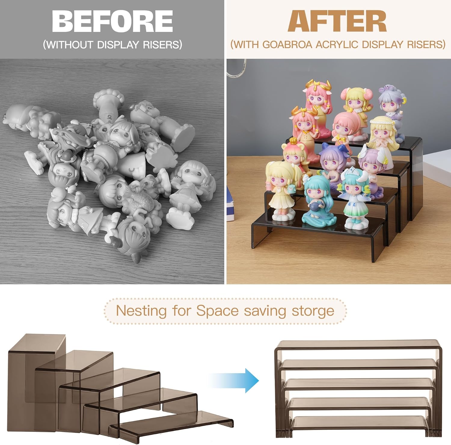 - Crystal-Clear Visibility: Goabroa display shelf for collectibles is made of 4mm (0.16”) thick clear acrylic panels that are strong and durable, ensuring they won’t yellow or bend over time; You can enjoy a floating visual experience with these clear acrylic display stands, designed to enhance the visibility of your products
