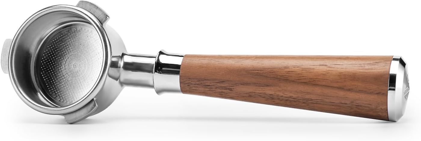 - UNIQUE WALNUT HANDLE. The handle of our bottomless portafilter is carefully crafted to ensure optimal comfort and stability during use. Made of natural walnut, the handle is designed to fit comfortably in your hand, providing a natural grip that minimizes fatigue and strain. The ergonomic design also ensures that the portafilter remains stable during the extracting process, allowing you to maintain precise control and achieve the perfect extraction every time