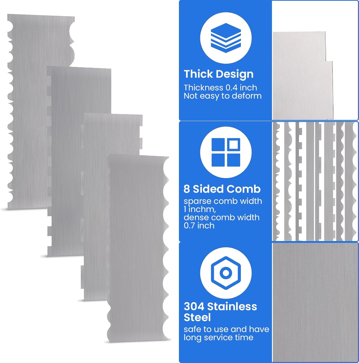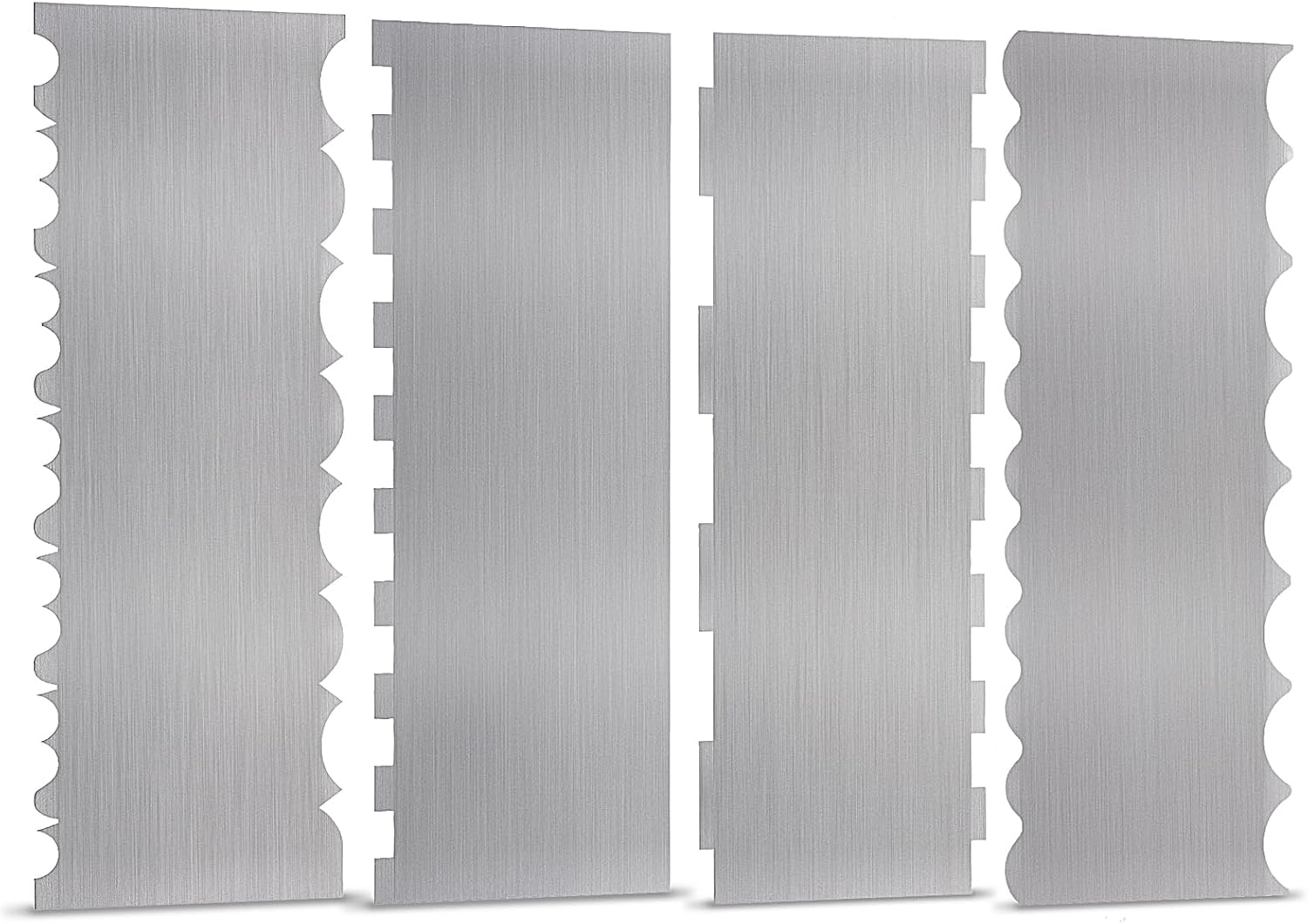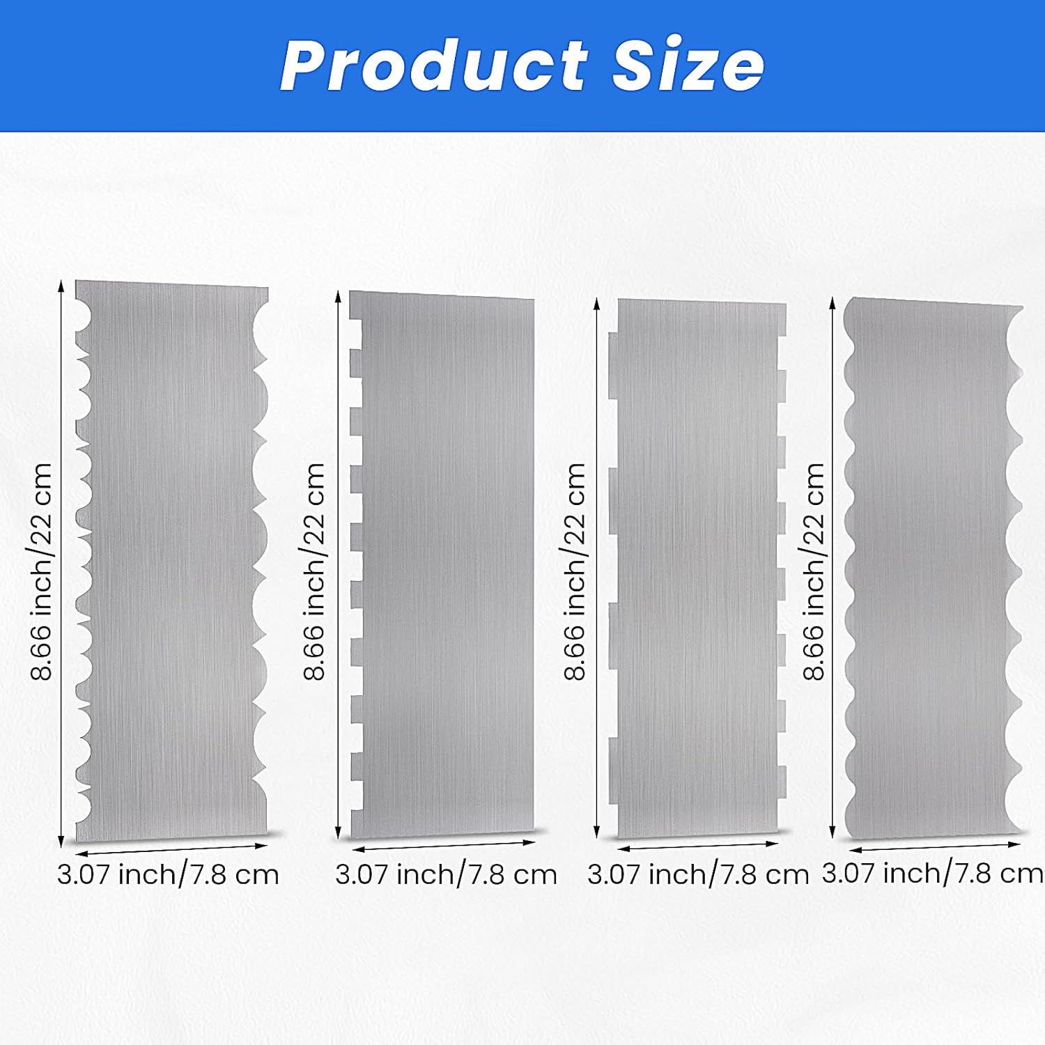 4 Pieces Stainless Steel Cake Scraper 10 Inch and Sided Patterned Edge Stripe Edge Smoother Scraper Cake Decorating Comb Cake Pastry Cutter for Mousse Butter Cream Cake Decoration