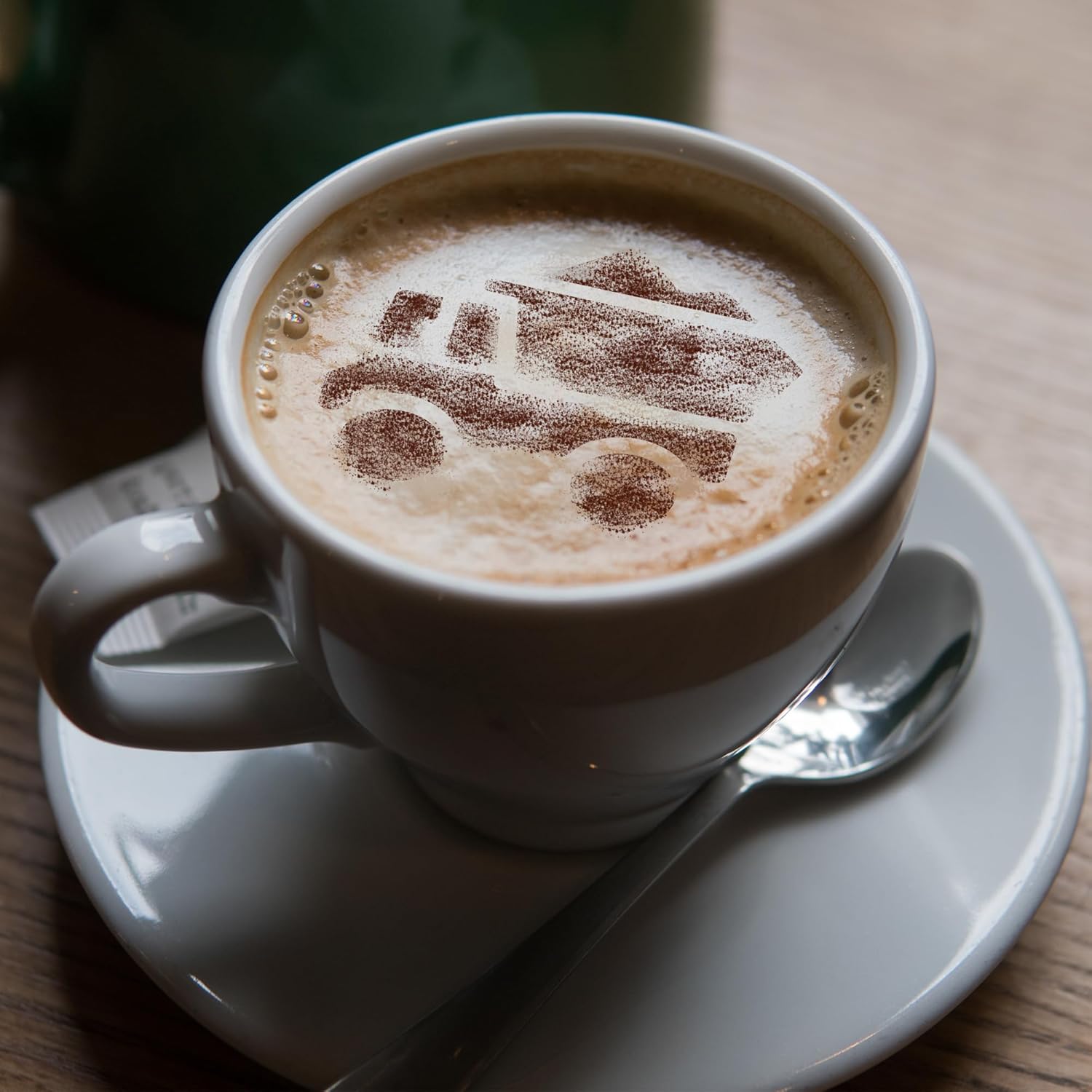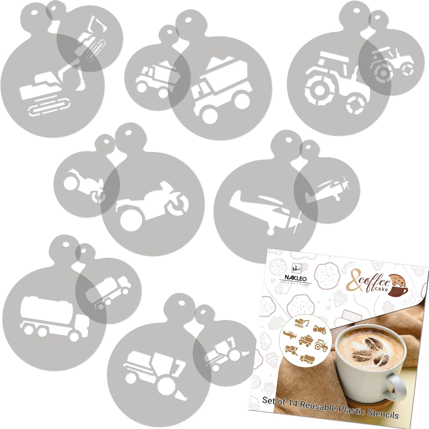 NAKLEO Coffee Stencils and Cookies Decoration 14Pcs 2.8”x2.8” and 4.3”x4.3”, Reusable Plastic Baking Templates, Transport Tractor Truck, Barista DIY Art Craft, Capuccino Latte Chocolate Cake Biscuit
