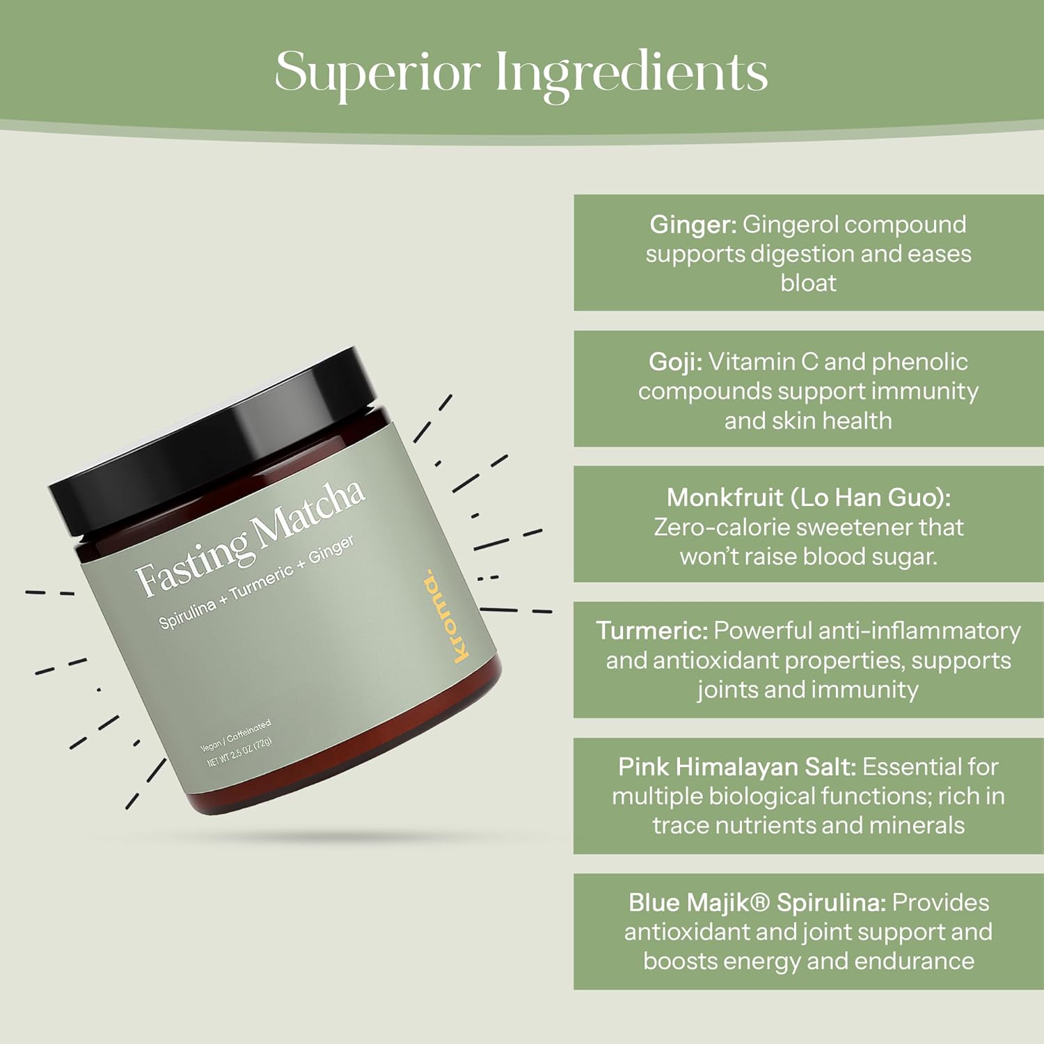 - FASTING MATCHA: A traditional matcha latte to promote calm alertness without breaking your fast. Swap coffee for this Organic Ceremonial Matcha Powder with added spirulina, turmeric, ginger, and goji.