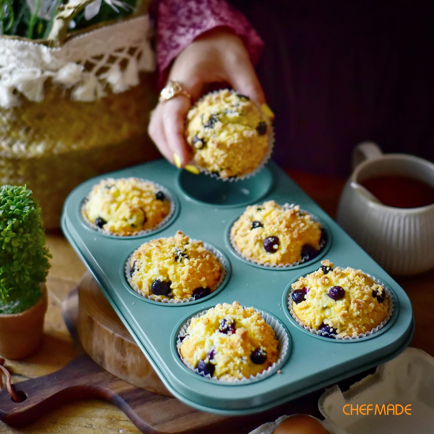 CHEFMADE Muffin Pan, 6-Cavity Non-Stick Cupcake Baking Pan Heavy Duty Carbon Steel Pan Muffin Tins Standard Baking Mold for Cakes(Green)