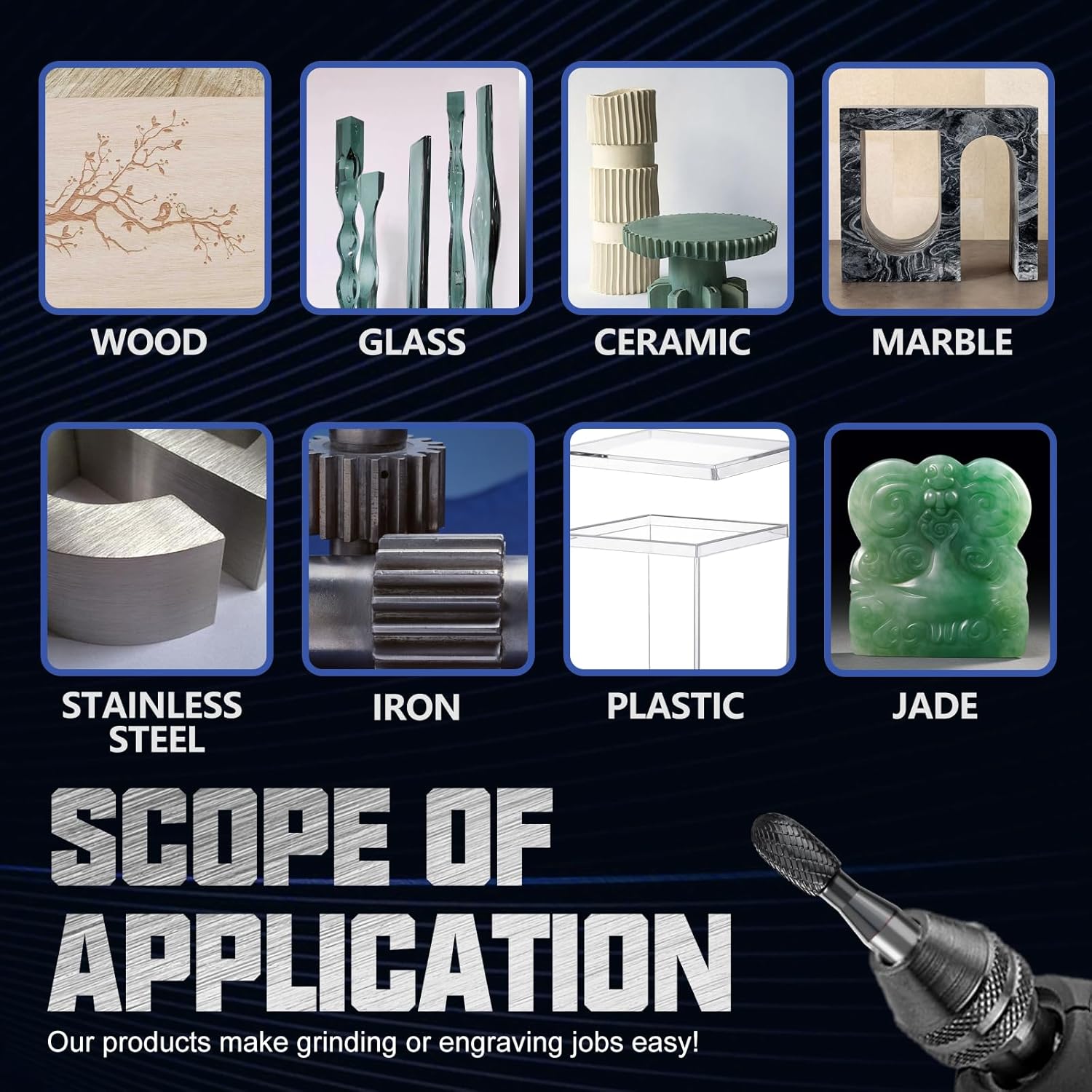 - 【Widely Applicable】: carving, chamfering, cleaning, contouring, cutting, deburring, elongating, engraving, grinding, meatalworking, milling, MRO, polishing, porting, sculpting, shaping, shaving, tooling, trimming, metal, wood and plastic, etc.