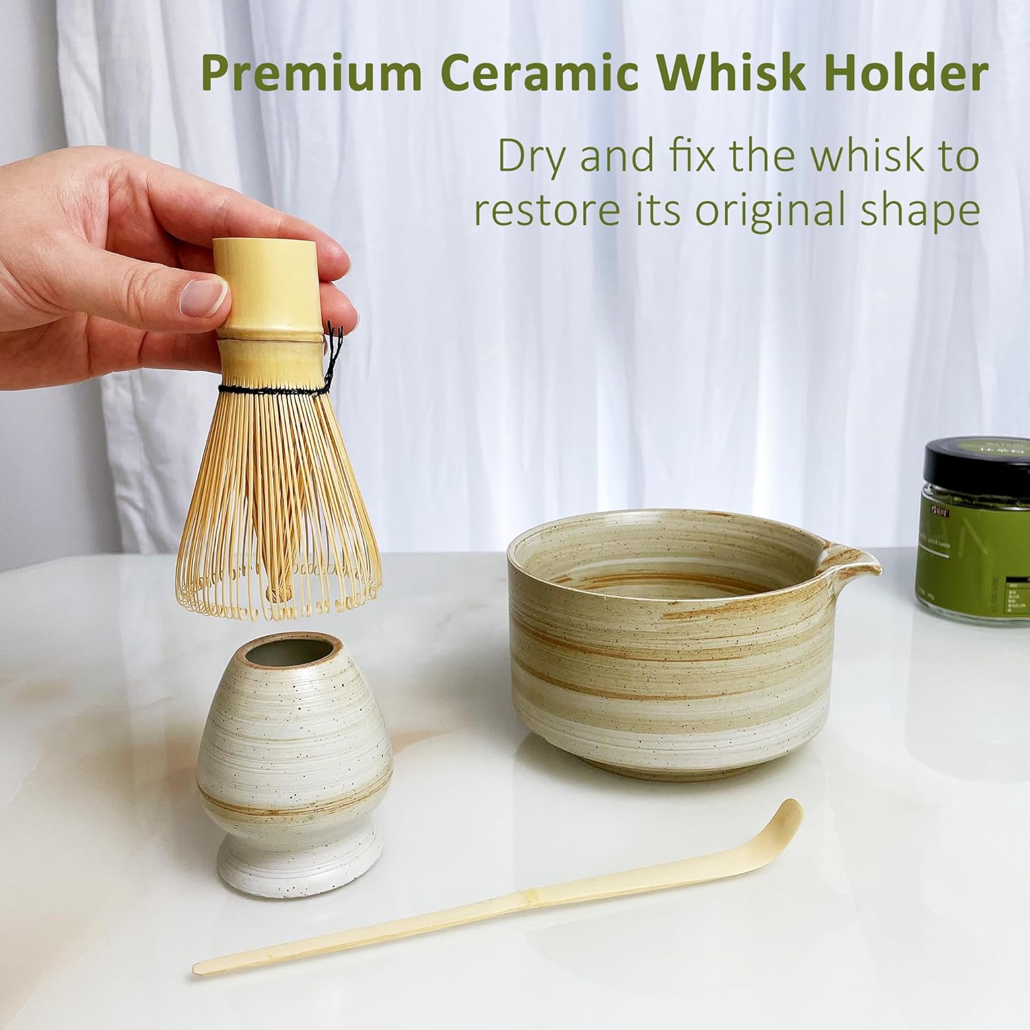 - EXQUISITE 100 BRISTLE BAMBOO WHISK: Our matcha whisk has 100 exquisite teeth, which can achieve fast and thorough stirring and full mixing, making the whole matcha making process simple to produce a luxurious frothy texture, bringing a silky and smooth matcha experience. The bamboo scoop can not only scoop the tea powder, but also scrape off all the residue in the bowl. The ceramic whisk holder can be used to fix and dry the whisk and restore it to its original shape