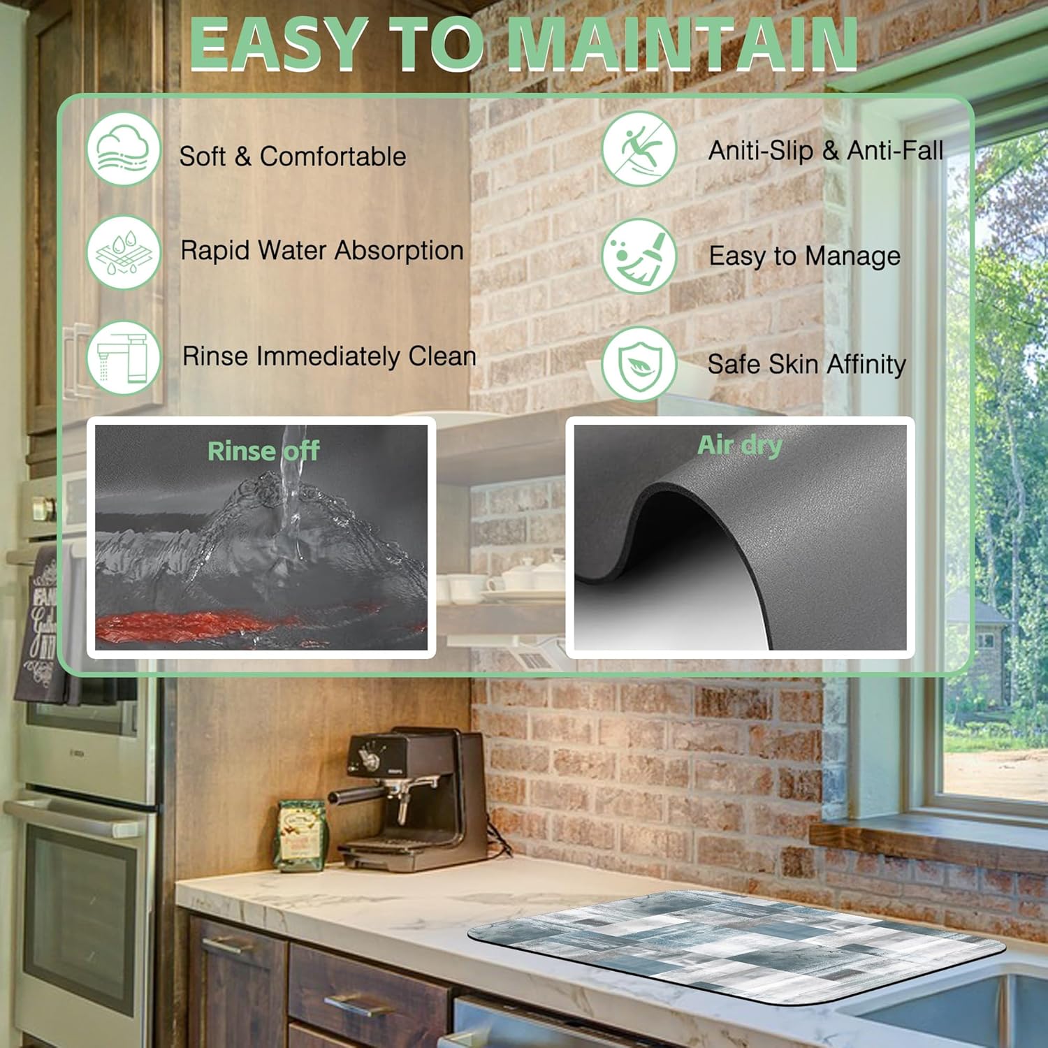 - 【Super Absorbent and Non-slip】The dish drying mat is made of absorbent suede and non-slip rubber. The surface is soft, wear-resistant and heat-resistant, and can quickly absorb water droplets from dishes. The non-slip textured rubber backing can firmly grip the counter, and dishes, water cups, coffee machines and kitchen utensils will not slide when placed on it. Perfect as a kitchen or coffee bar accessory.