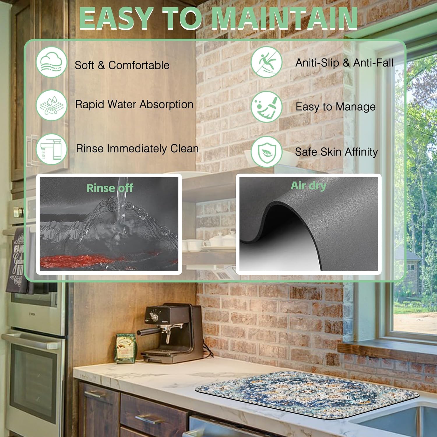 - 【Super Absorbent & Non-slip】The coffee mat is made of absorbent suede and non-slip rubber. The surface is soft, wear-resistant and heat-resistant, and can quickly absorb the coffee and water droplets. The non-slip textured rubber backing can firmly grip the counter, and the coffee machine, coffee pot and kitchen utensils will not slide when placed on it. It is very suitable as a kitchen or coffee bar accessory.