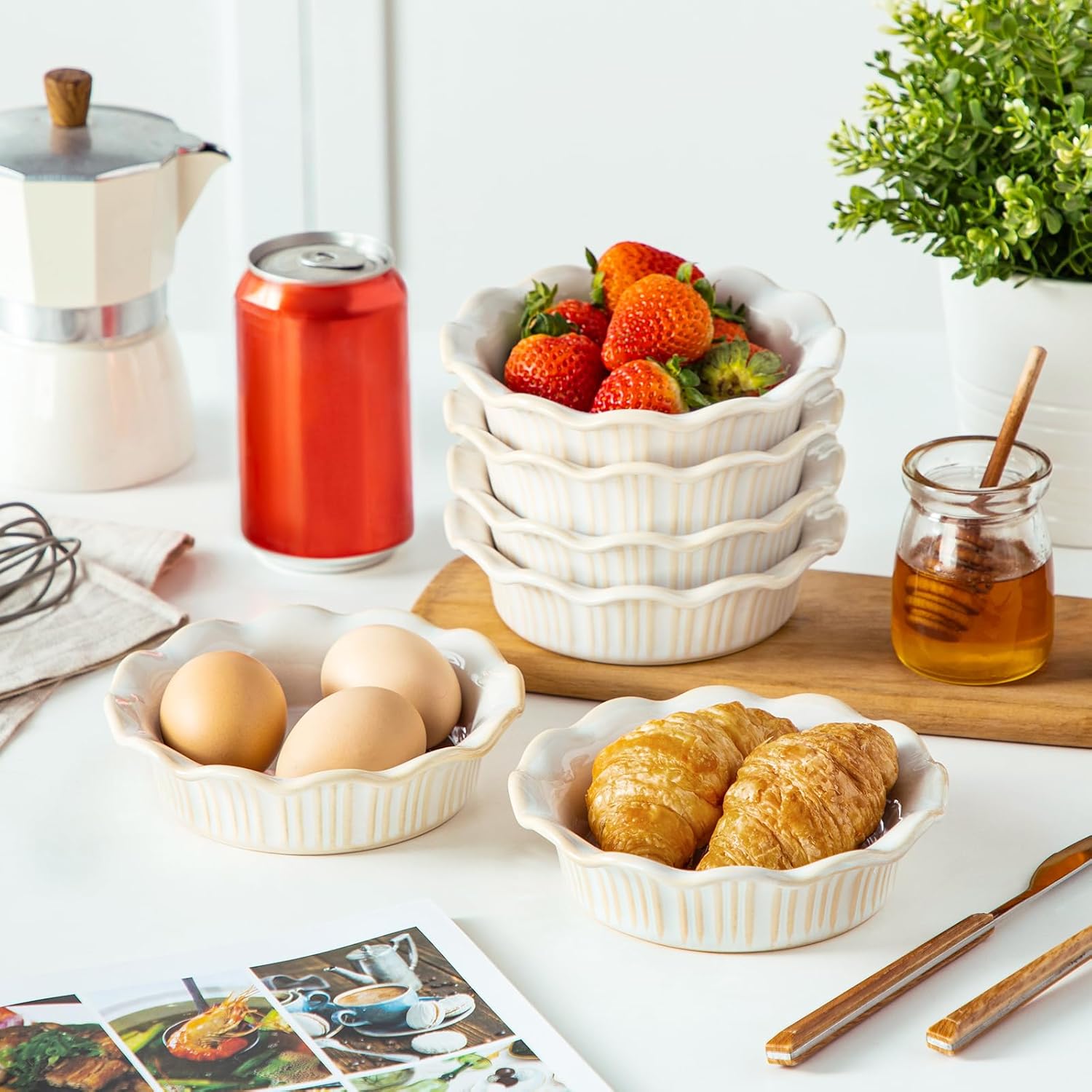 - 【Suitable for Parties and Gatherings】The Vancasso ceramic mini pie pans have a 9-ounce capacity, a diameter of 5.2 inches, and a depth of 1.5 inches. They are the ideal single-serving size for regulating meal portions and producing individual desserts for all of your guests. Everyone can enjoy wonderful cuisine without worrying about overeating. They're perfect for quiches, chicken pot pies, and fruit pies like apple, peach, and blueberry. They're also fantastic for holding chopped ingredients, peanuts, chocolates, garnishes, sauces, and more