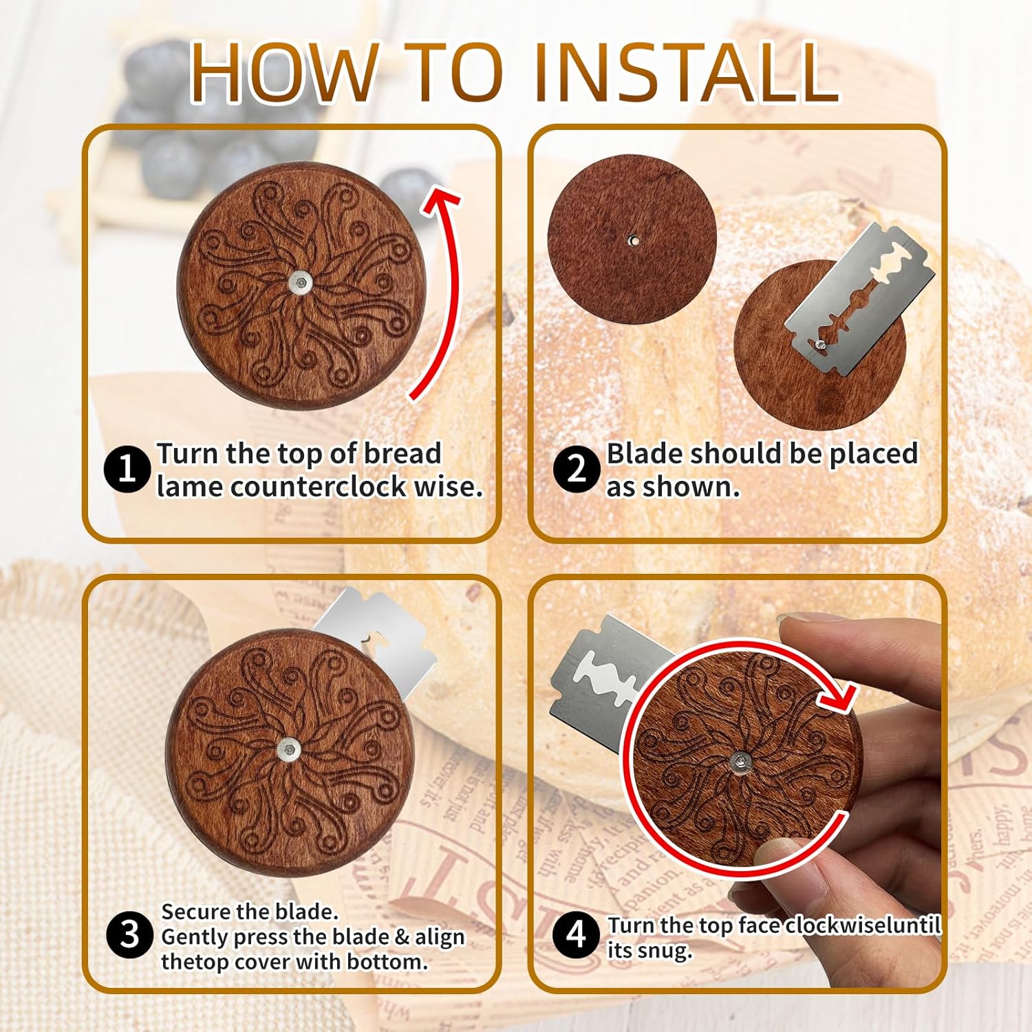 - EASY TO INSTALL - ① Twist the UFO bread lame counterclockwise to separate;② Align the razor's center slot with the screw post;③ Secure wood rings with a clockwise twist.【tips: Prevent slippage by pinching the blade between thumb & index finger while cradling the base with your middle finger! Watch our 43-second video guide in the listing before starting.】