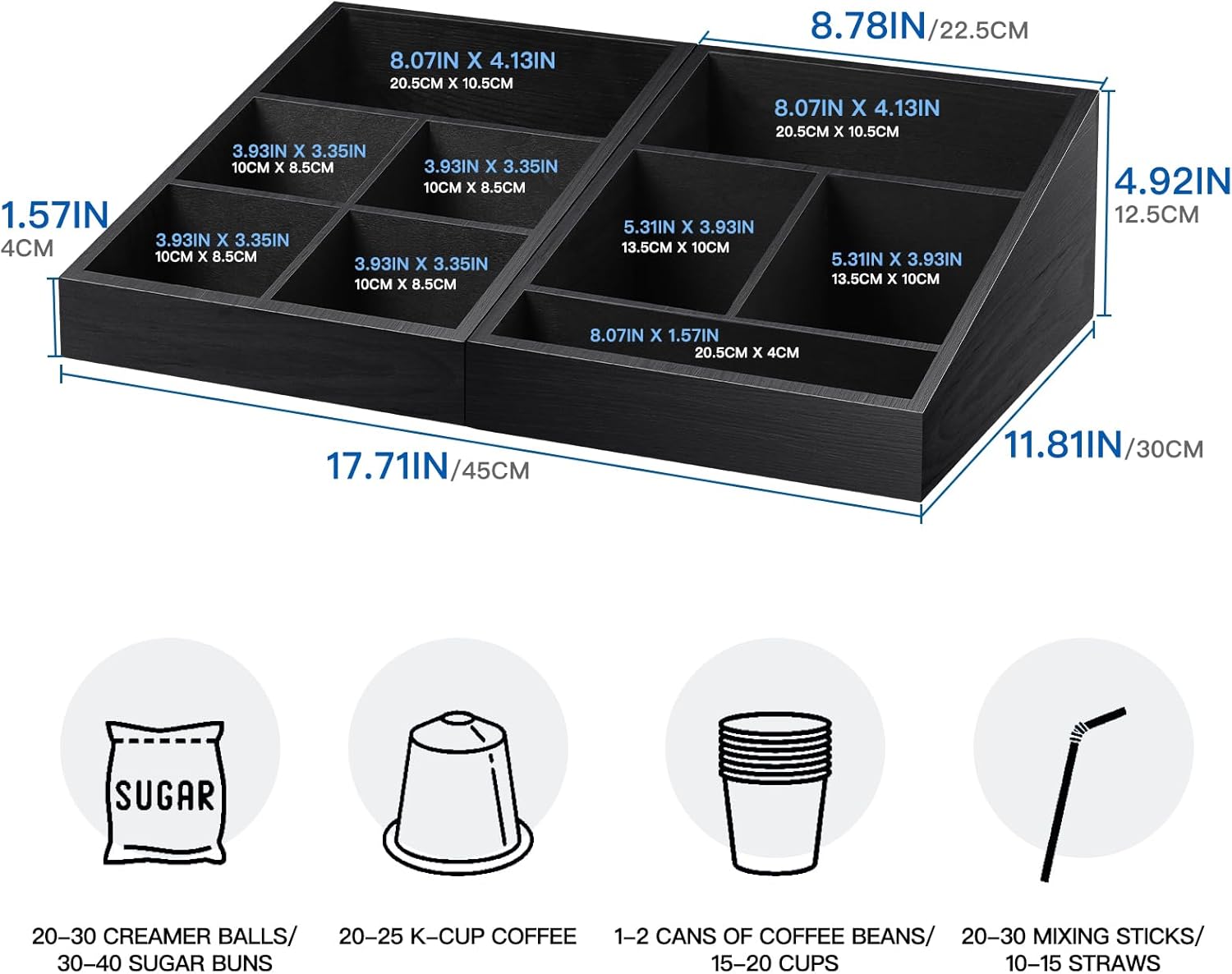 - THOUGHTFUL DESIGN & STORAGE SPACE: Equipped with a spacious compartment, our Coffee Station Organizer accommodates an array of coffee accessories. You can use to store k-cups, sugar packets, tea bags, creamers, everything finds its place within the generous storage space, allowing easy access and decluttering your coffee station.