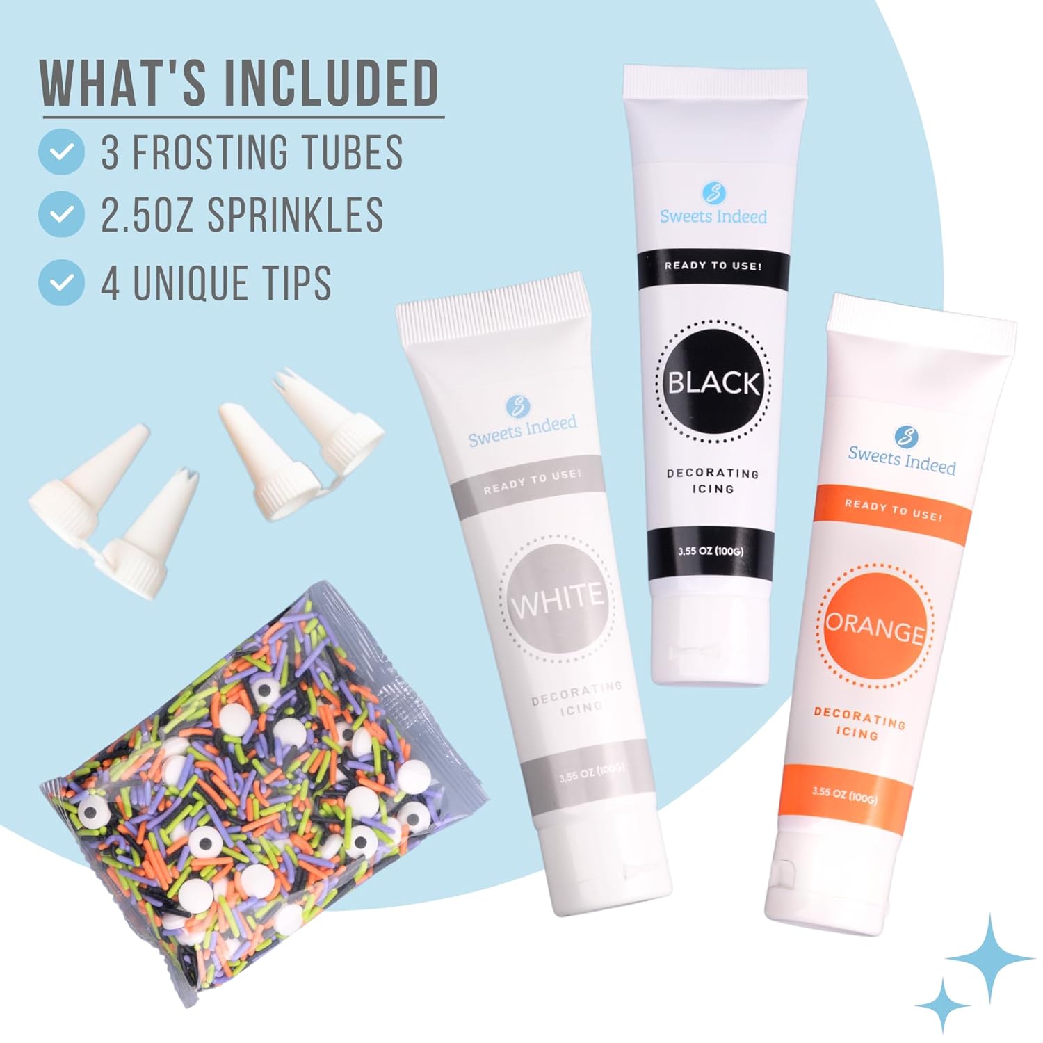 - 11.31 oz Complete Decorating Kit – Everything you need in one box: 3 squeeze frosting tubes (3 oz each in Orange, Black, White), 4 decorating nozzles, and a 2 oz Halloween sprinkle mix with candy eyeballs.