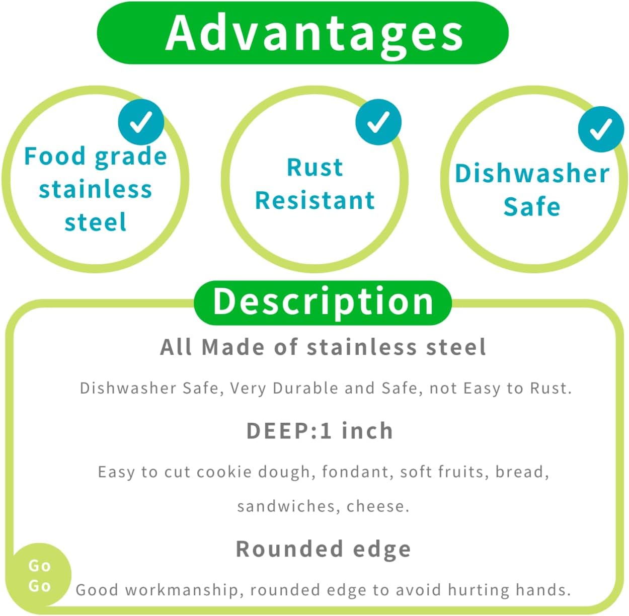 - Size:From 1.5 to 2 Inches.DEEP:1 inch.Easy to cut cookie dough, fondant, soft fruits, bread, sandwiches, cheese.