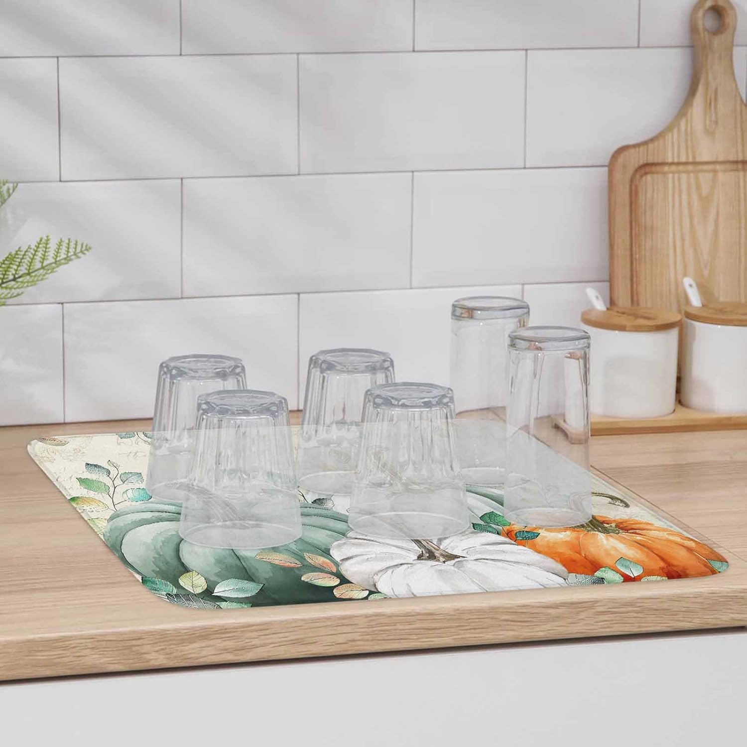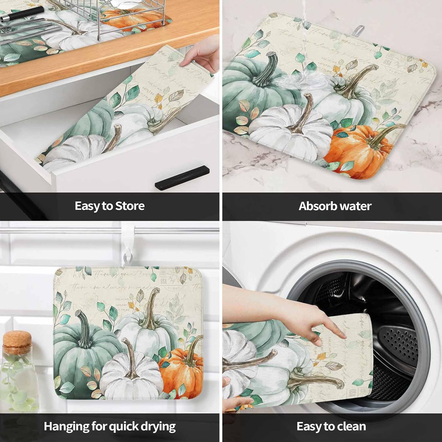 Fall Dish Drying Mat for Kitchen Counter Green Pumpkin Drying Pad Absorbent Drying Mats for Countertops Sinks Draining Racks Eucalyptus Leaves Drainer Holiday Harvest Thanksgiving Decorations 16x18