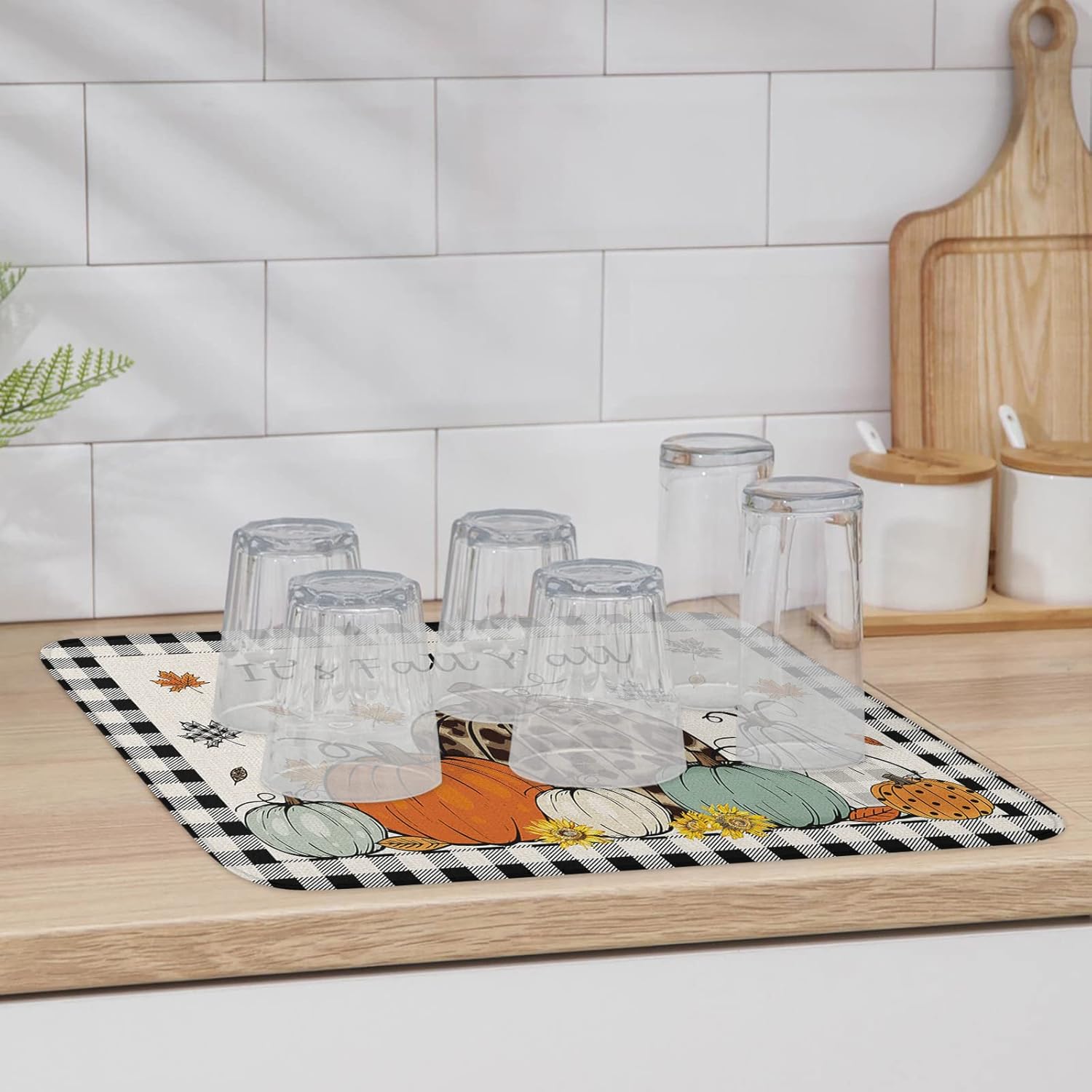 Fall Dish Drying Mat for Kitchen Counter Pumpkin Drying Pad Absorbent Drying Mats for Countertops Sinks Draining Racks Maple Leaves Black Buffalo Plaid Drainer Holiday Harvest Thanksgiving Decor 18x24