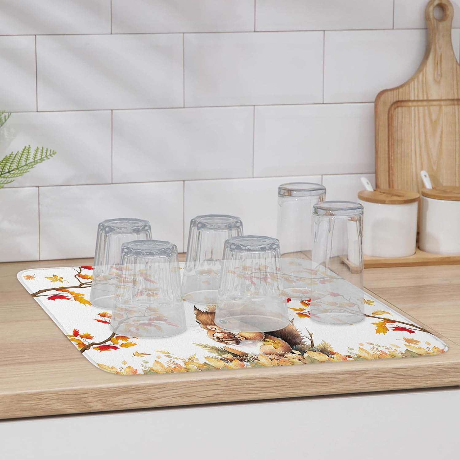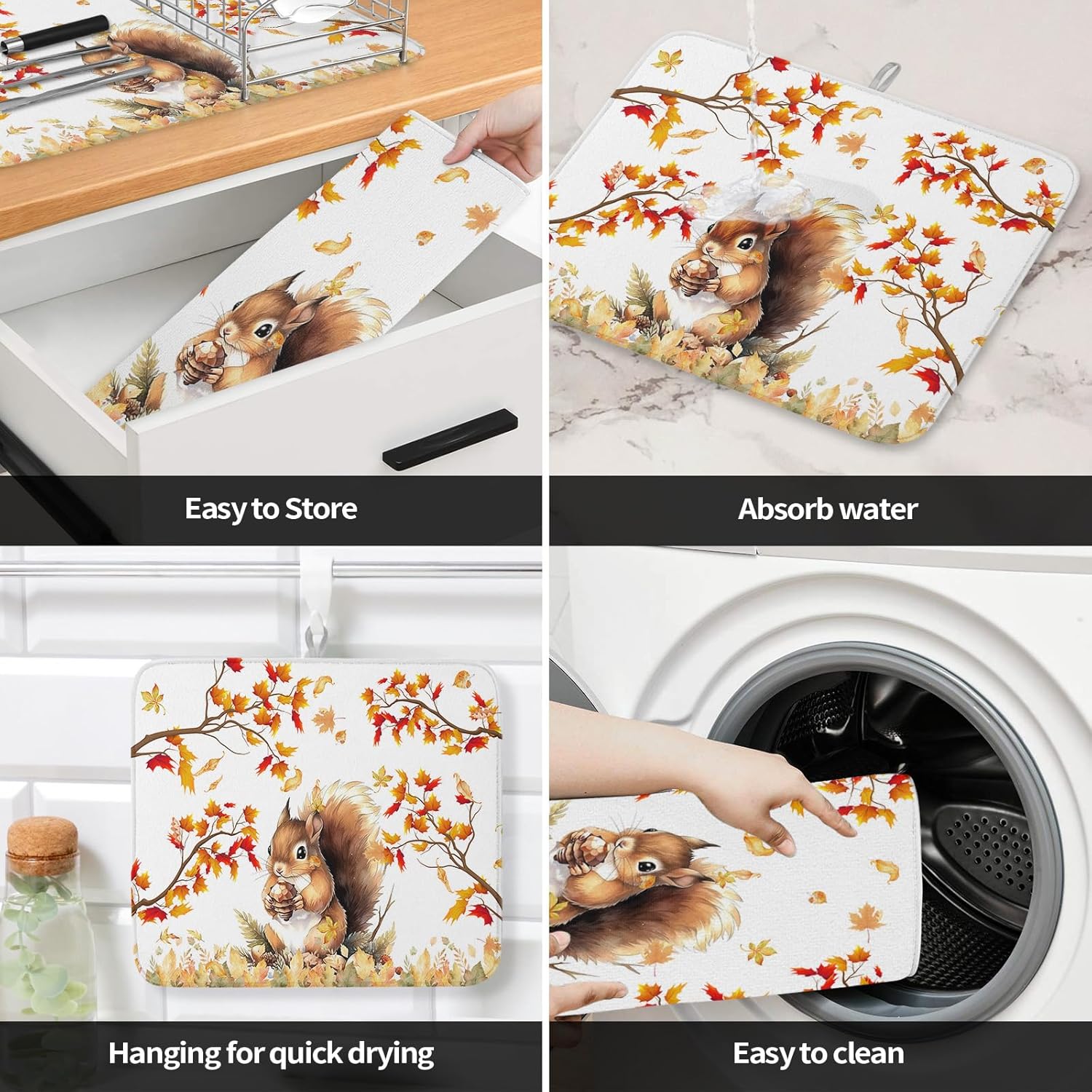 - Fall & Thanksgiving Decor - Squirrel with autumn maple leaves drying mats can add an chic holiday vibe and charm to your kitchen or coffee bar counter. The drying mat for kitchen counter with a unique hanging rope design that can be hung without occupying any space.