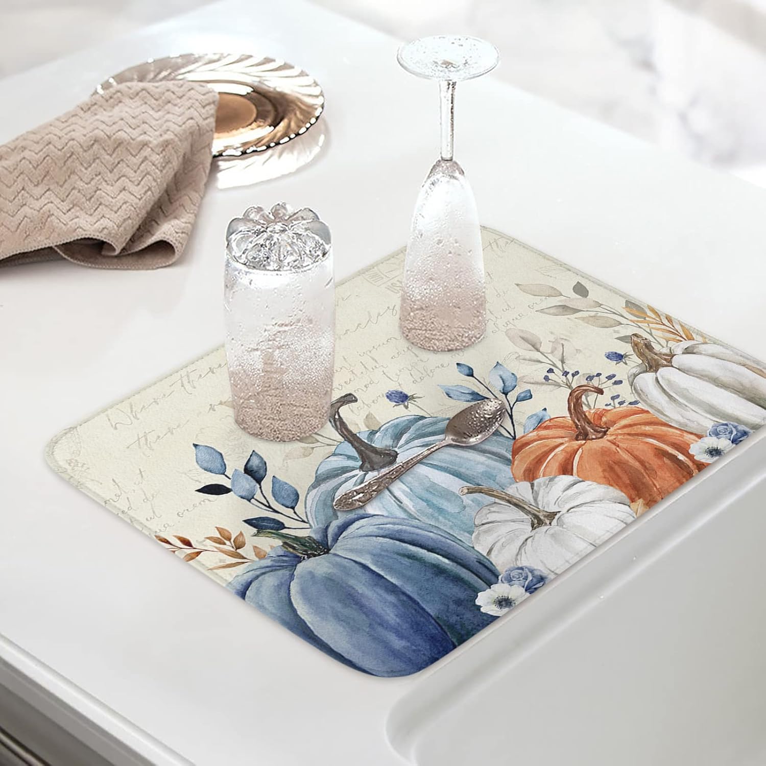 Fall Dish Drying Mat for Kitchen Counter Blue Pumpkin Drying Pad Absorbent Drying Mats for Countertops Sinks Draining Racks Floral Leaves Drainer Holiday Harvest Thanksgiving Decorations 18x24