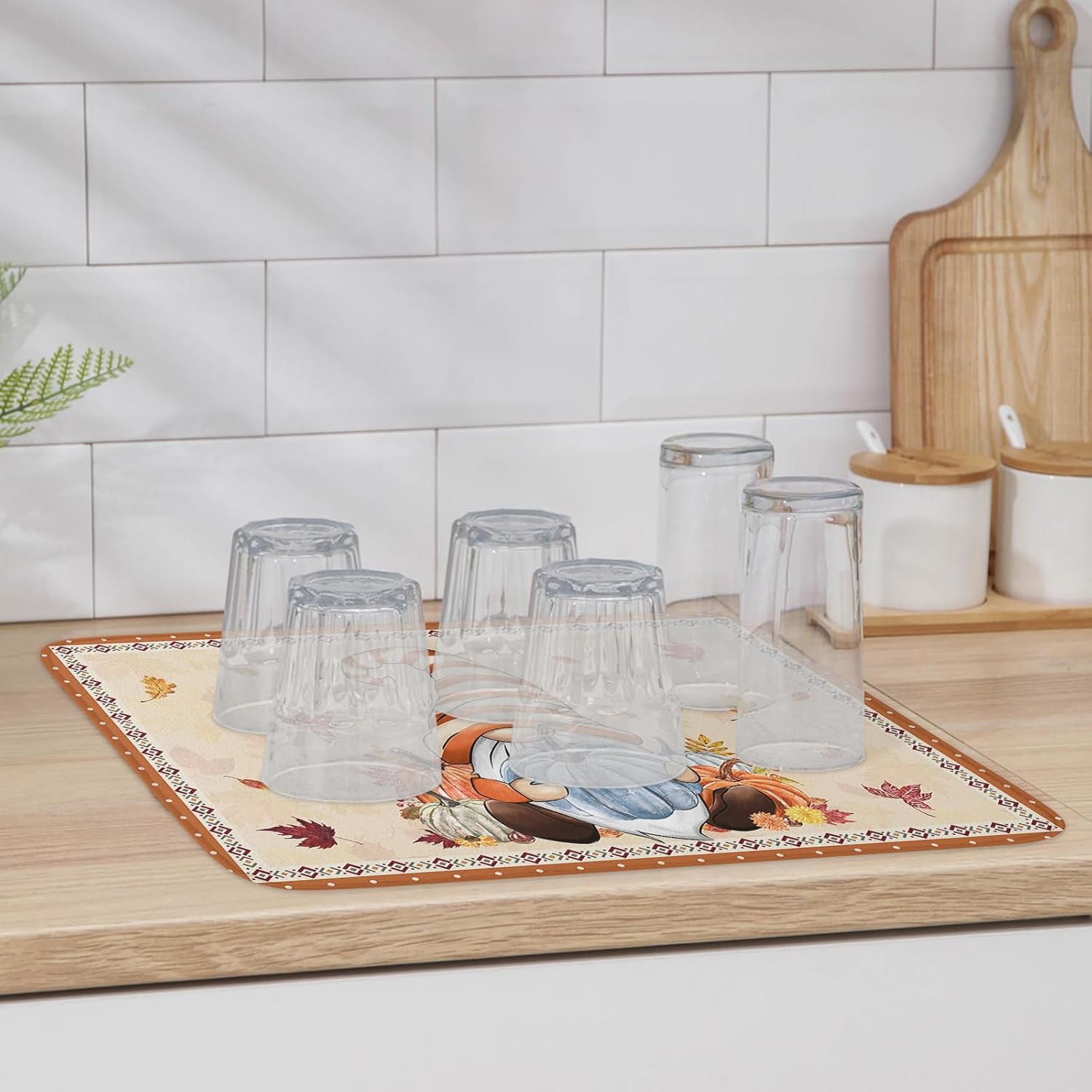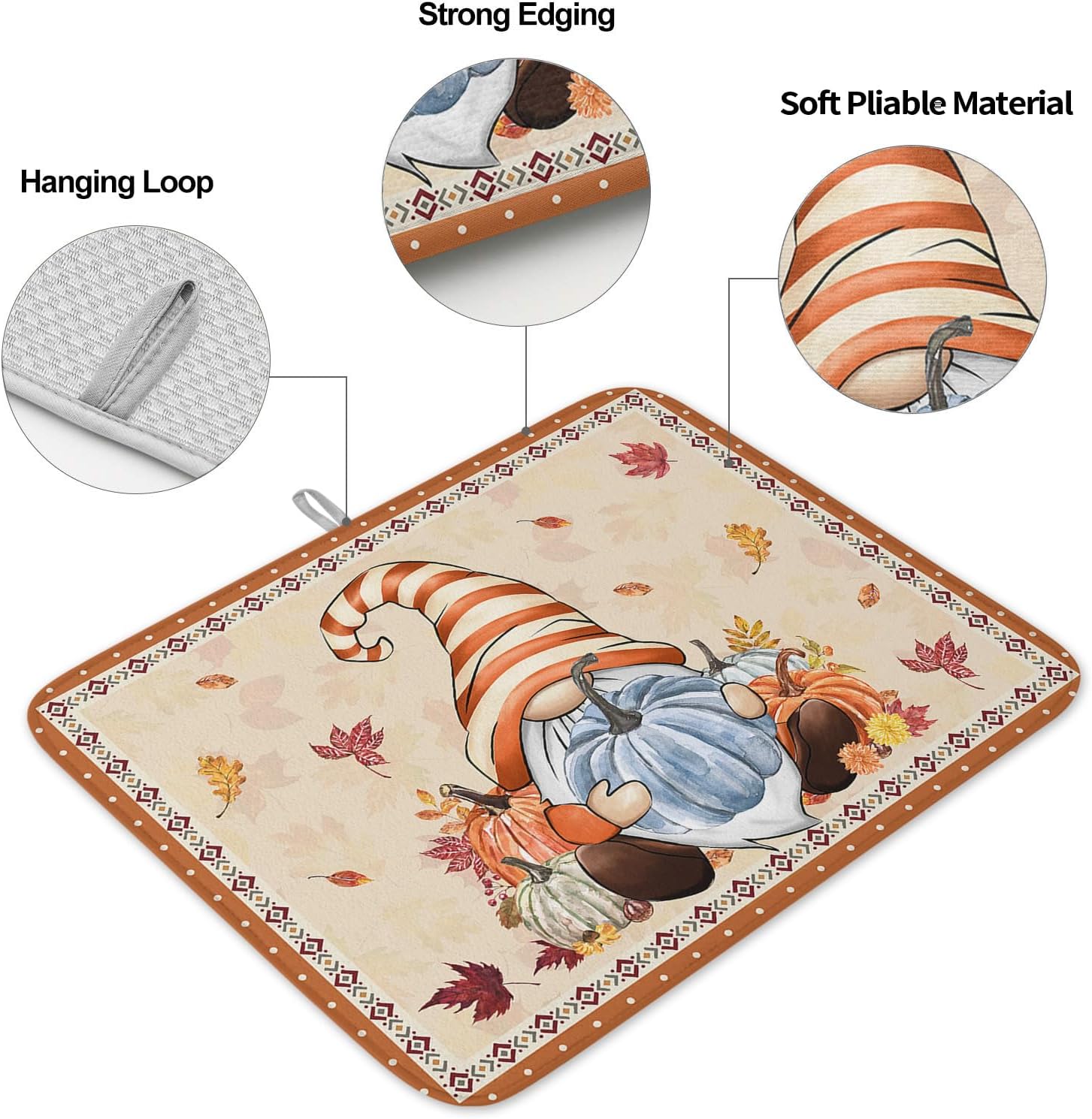 Fall Dish Drying Mat for Kitchen Counter Pumpkin Gnome Drying Pad Absorbent Drying Mats for Countertops Sinks Draining Racks Autumn Maple Leaves Drainer Holiday Harvest Thanksgiving Decorations 18x24