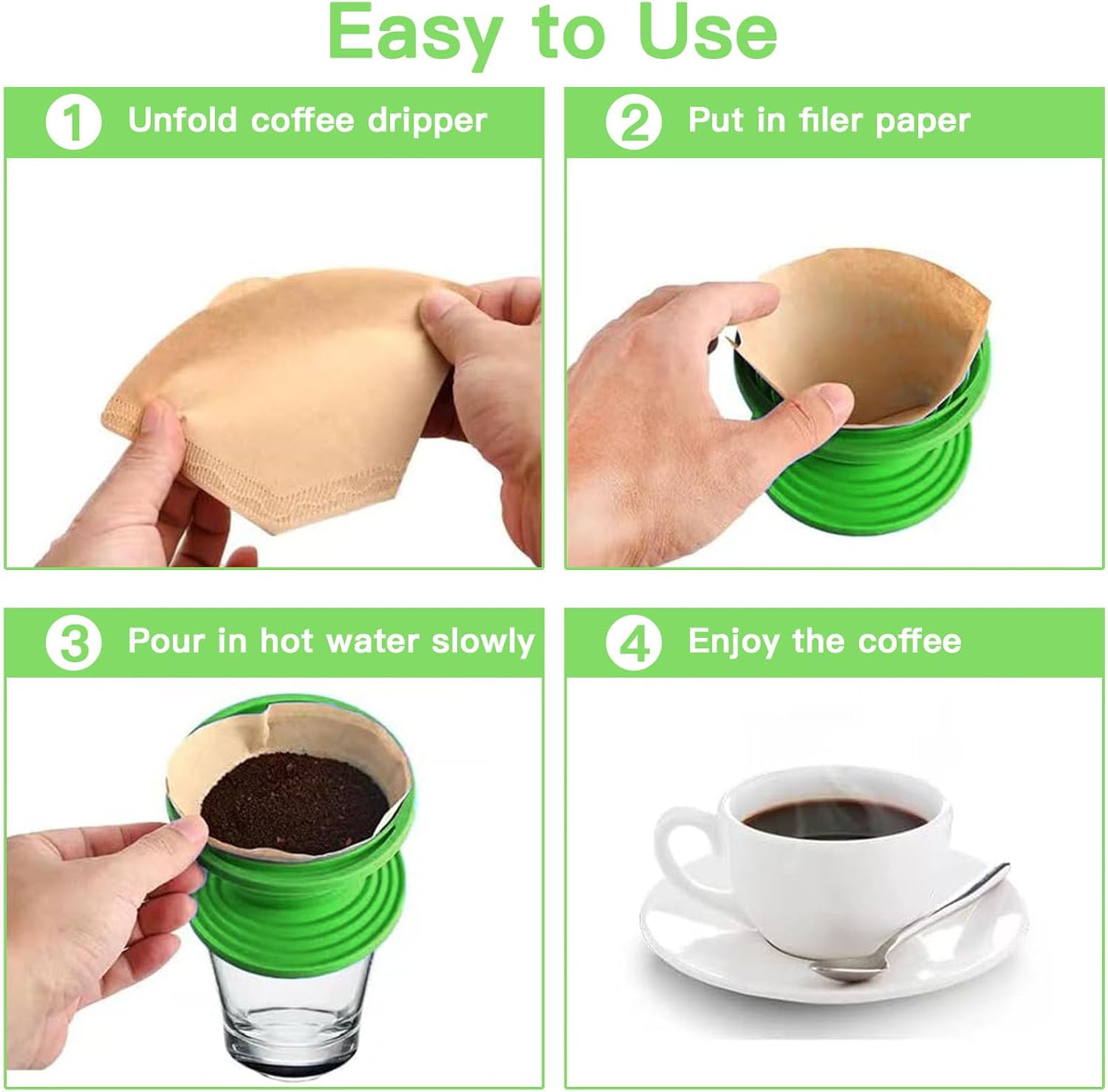 Collapsible Pour Over Coffee Dripper Set - Silicone Reusable Cone Filter Holders with 100Pcs Paper Filters - For Home, Camping, Travel, Office (1, Green)