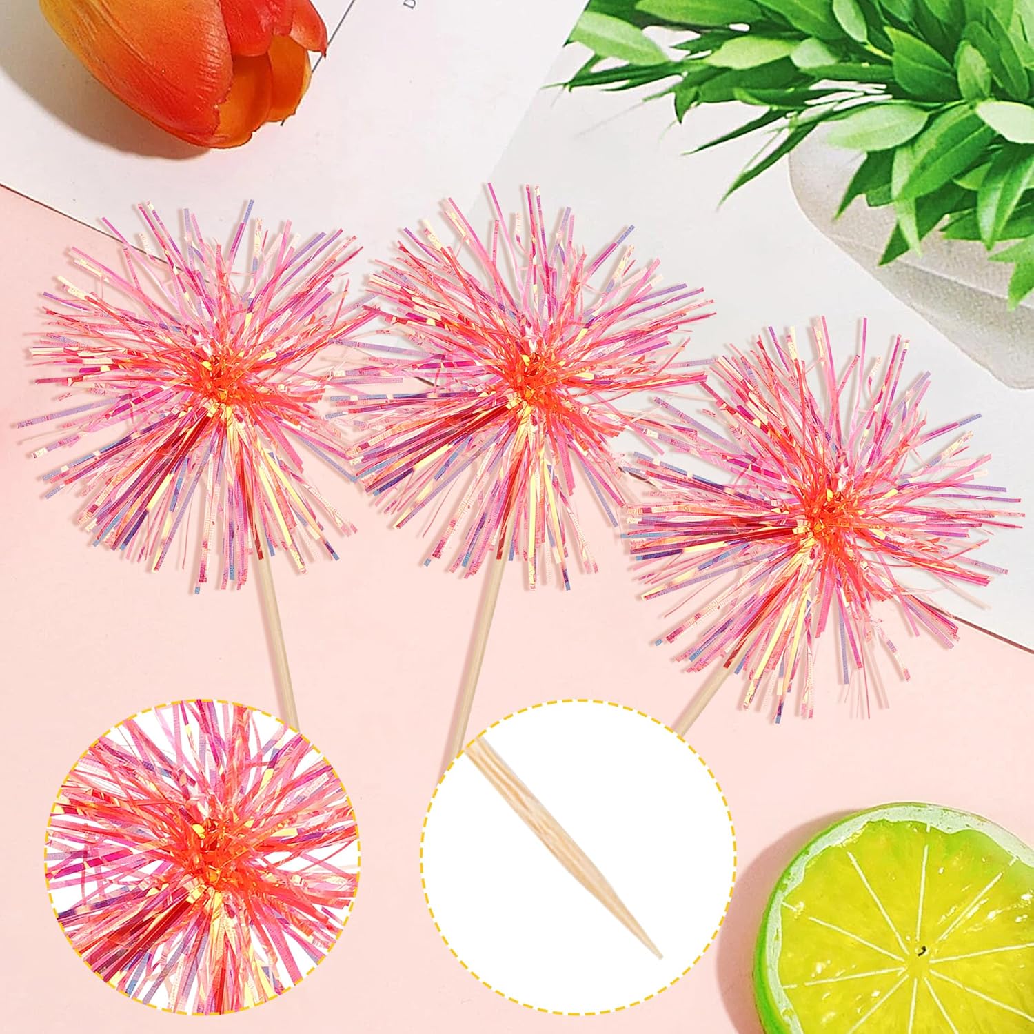30 PCS Foil Firework Cupcake Toppers Happy Birthday Cupcake Toppers Sparkle Tinsel Flower Drink Stirrers Cocktail Fruit Toothpicks for Valentine's Day Baby Shower Party Cake Decor Supplies Orange