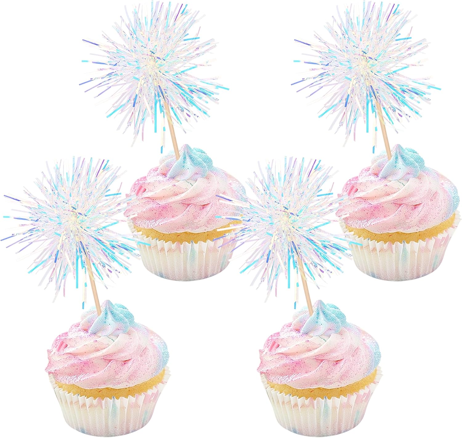 30 PCS Foil Firework Cupcake Toppers Happy Birthday Cupcake Toppers Sparkle Tinsel Flower Drink Stirrers Cocktail Fruit Toothpicks for Valentine's Day Baby Shower Party Cake Decor Supplies White