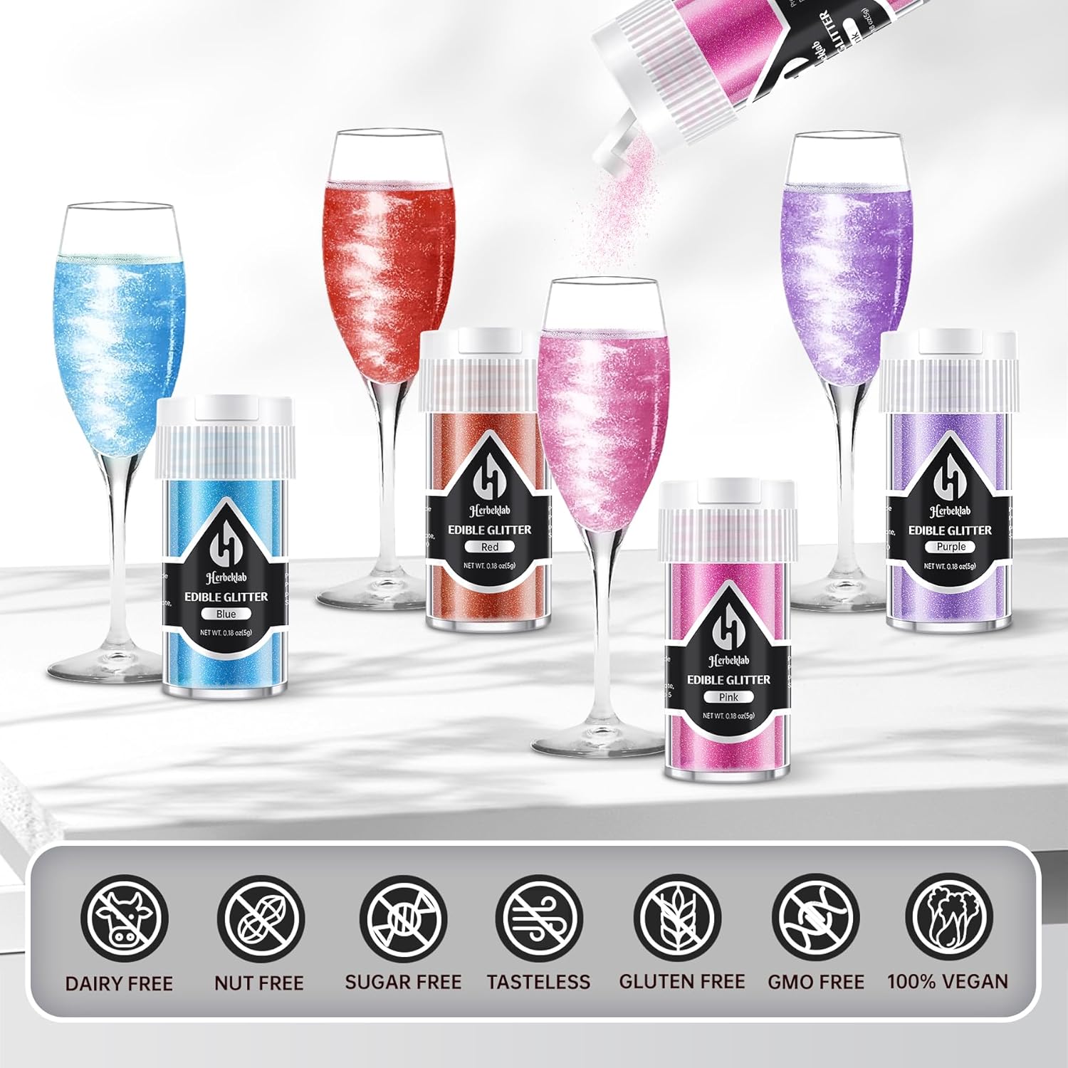- 🍭[ Edible Glitter for Cocktails & Cakes ] The luster dust edible is available in 6 different colors like pink, purple, red, blue, green and dreamlike violet. Herbeklab edible glitter for cocktails is packed well; each drink glitter is filled with 5 grams of glitter powder.