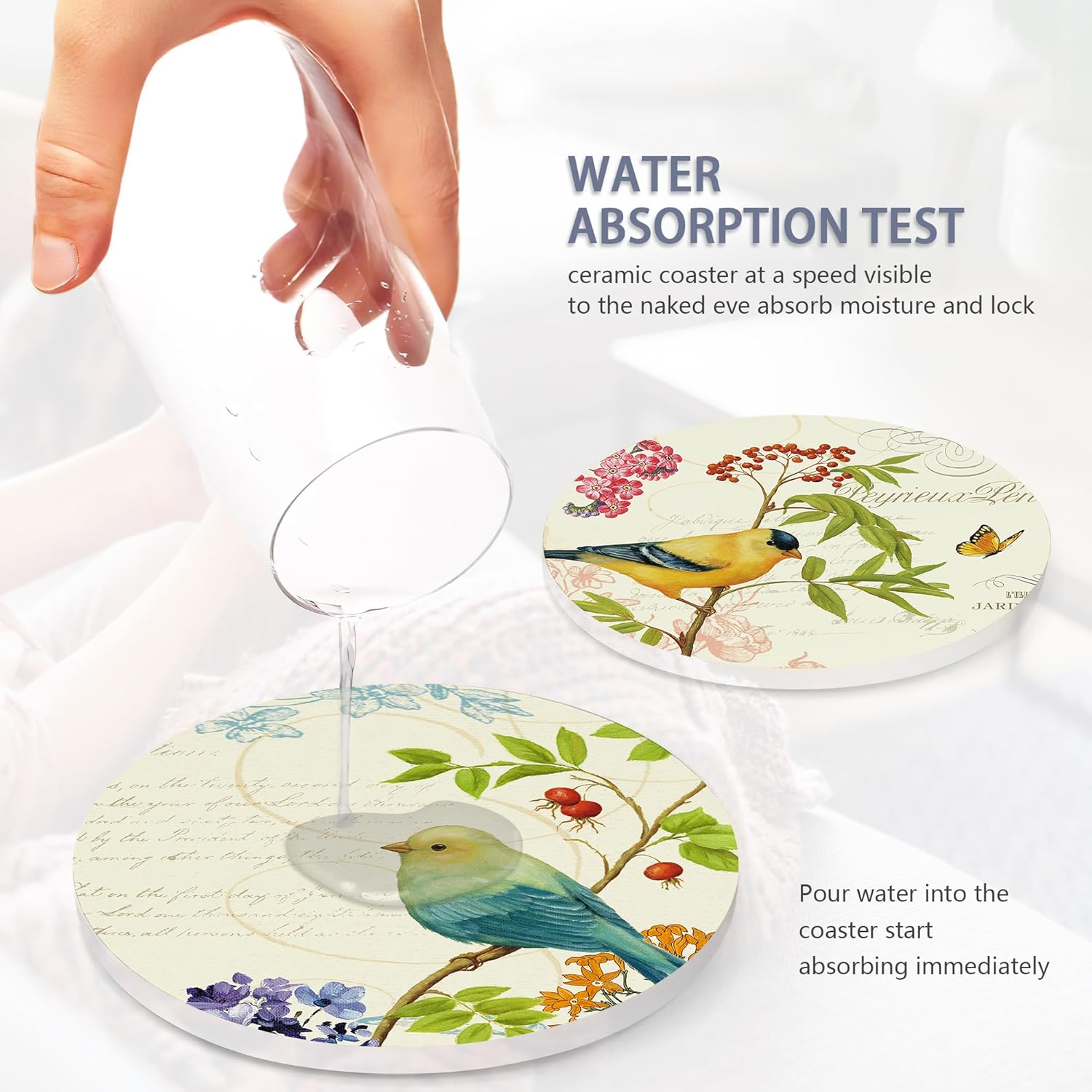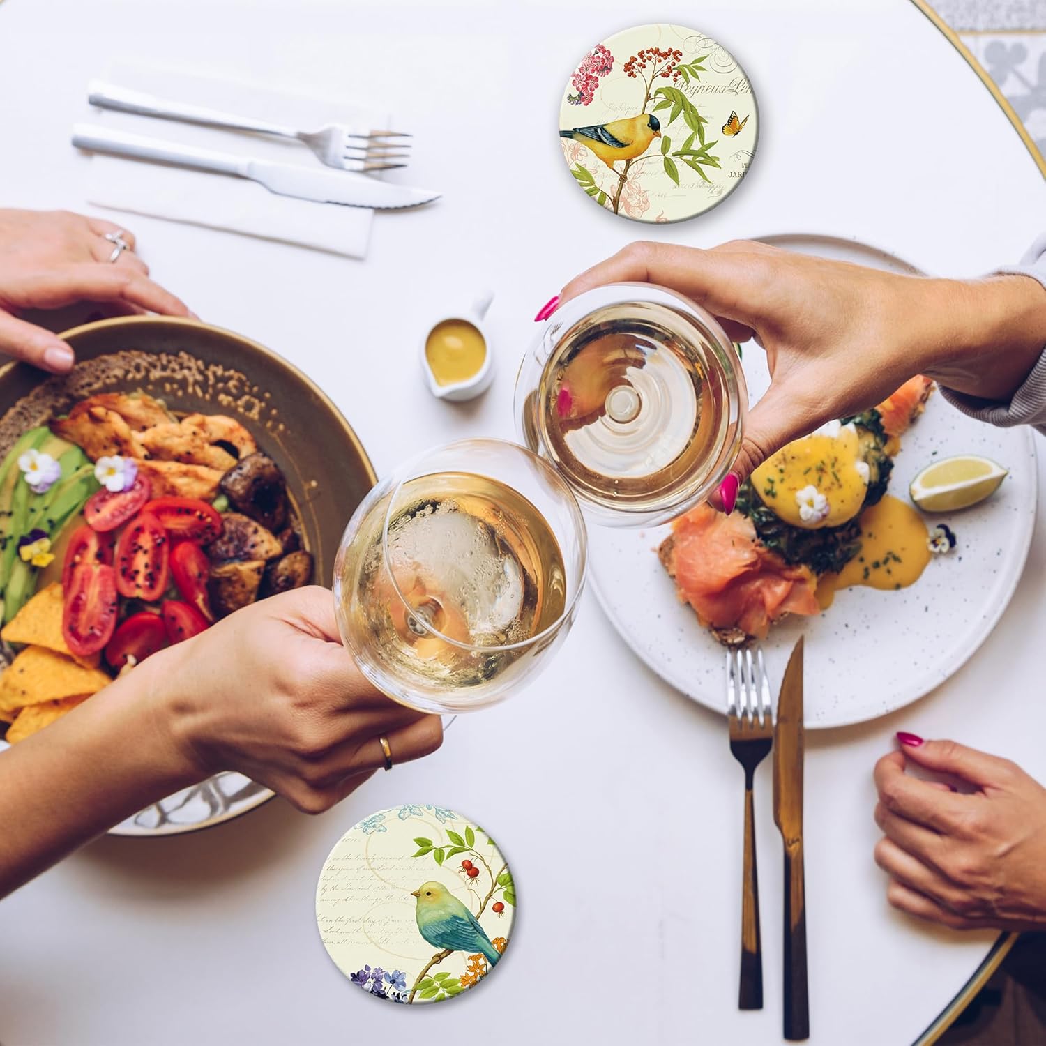 Coaster for Drinks Set of 6, Vintage Watercolor Bird Flower Absorbing Round Ceramic Stone Coaster with Cork Base,Tabletop Protection Mat for Mugs and Cups,Coffee Table Wine Glass Home Bar 4 Inch
