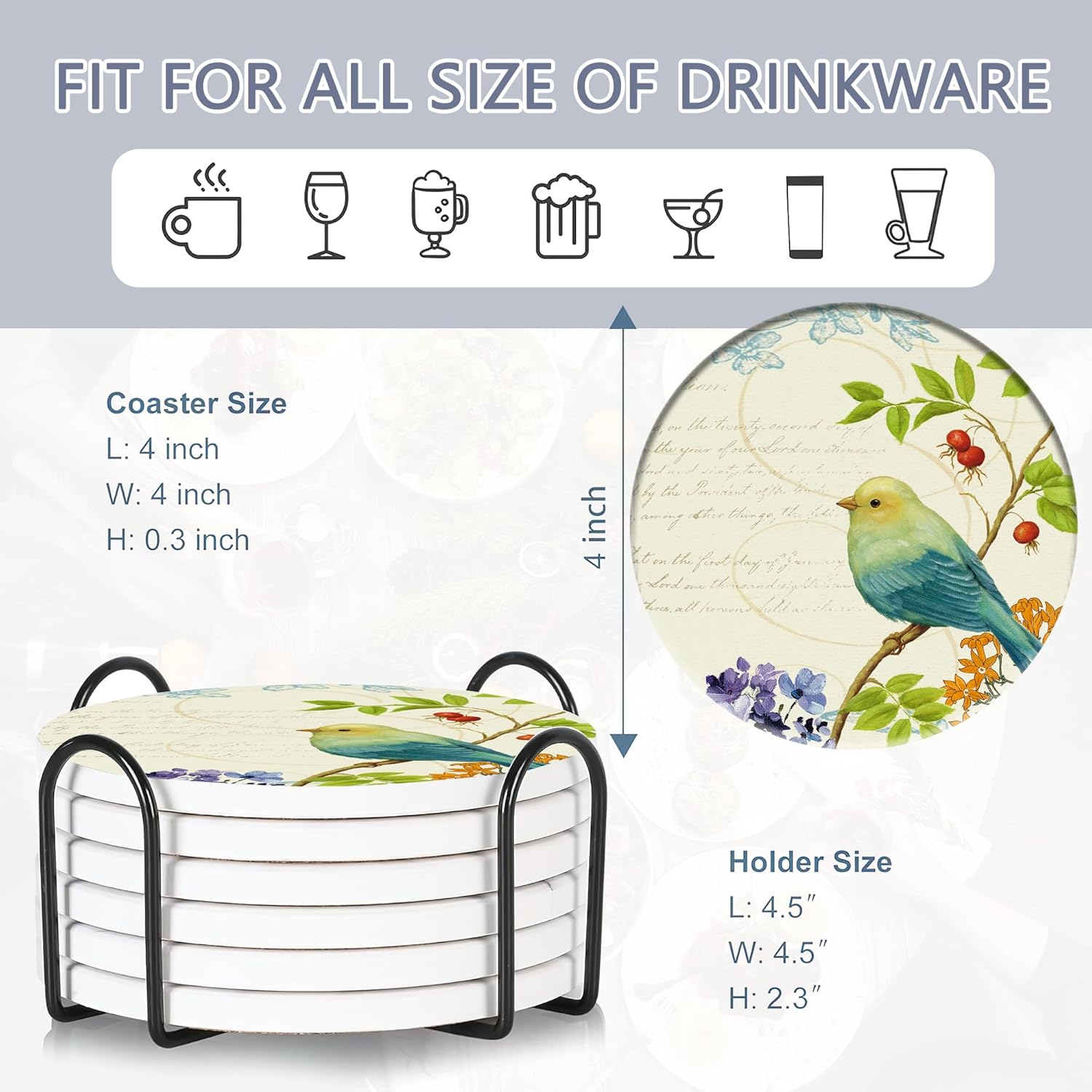 - Husiti Ceramic Coasters Set With Metal Holder: Keep Your Dining Table Stylish And Organized With This Set Of 6 4-Inch Round Coasters Featuring a Trendy Vintage Watercolor Bird Flower Pattern.