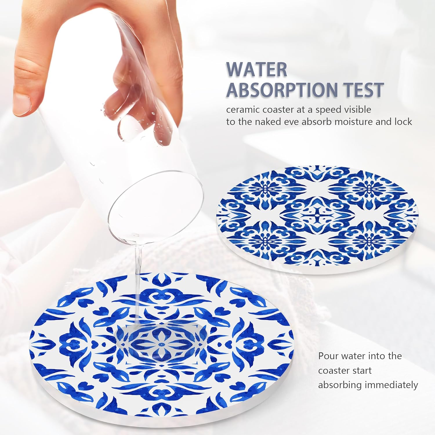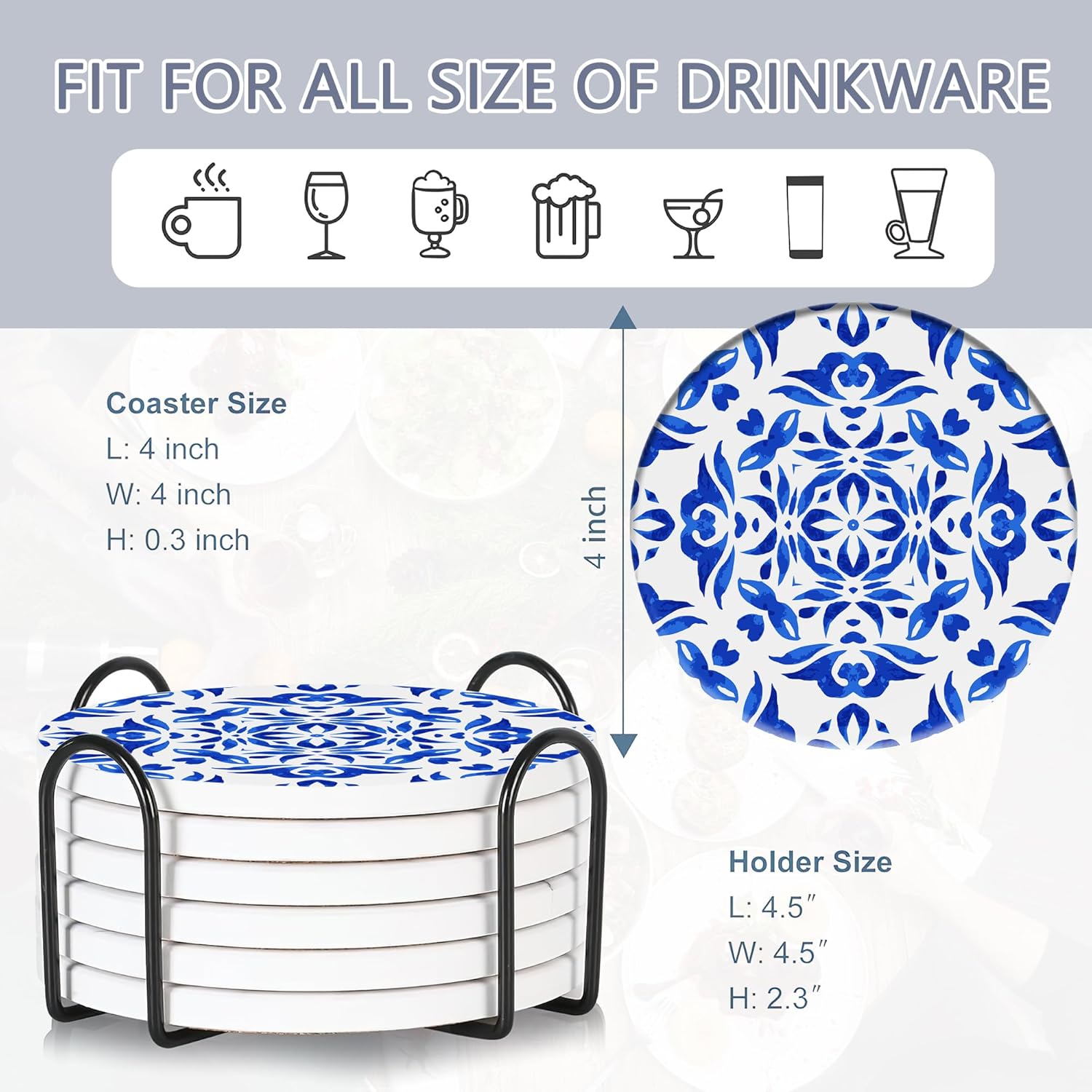 - Husiti Ceramic Coasters Set With Metal Holder: Keep Your Dining Table Stylish And Organized With This Set Of 6 4-Inch Round Coasters Featuring a Trendy Handpainted Blue Pattern Pattern.