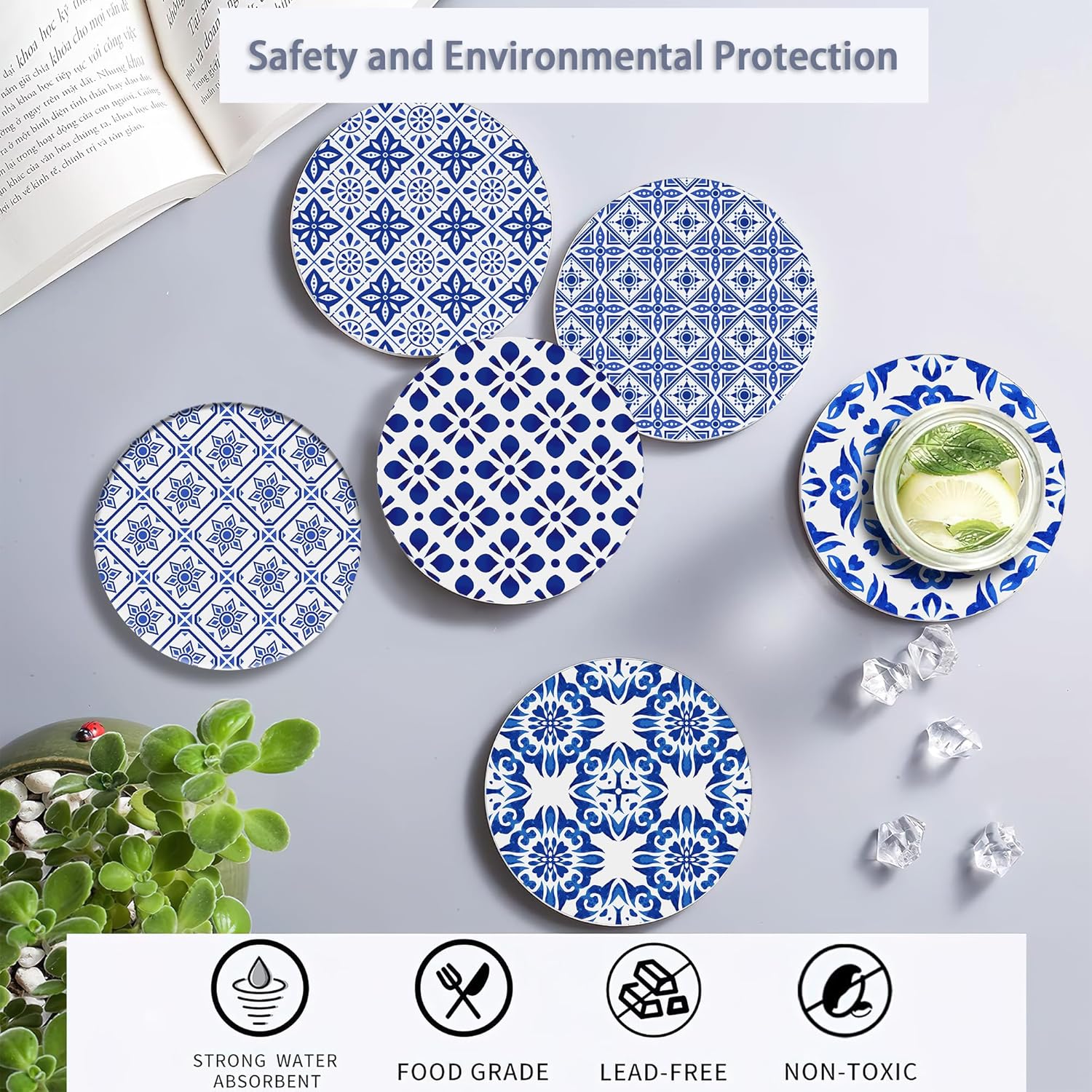 - Water-Absorbent And Cork Base: Crafted From Ceramic With a Cork Base, These Coasters Prevent Scratches And Water Stains While Providing a Non-Slip Effect For Your Drinks.