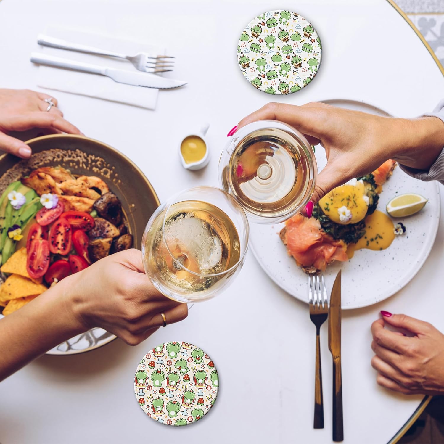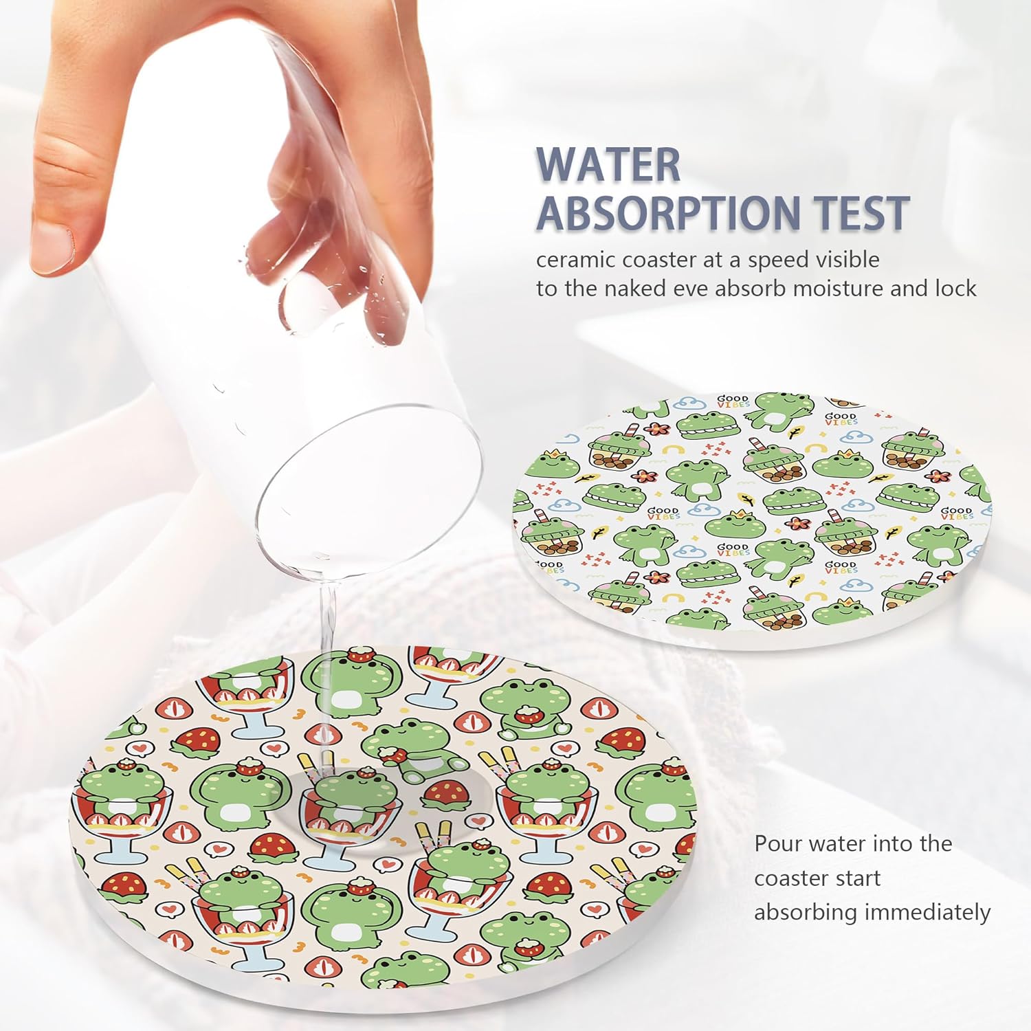 - Husiti Ceramic Coasters Set With Metal Holder: Keep Your Dining Table Stylish And Organized With This Set Of 6 4-Inch Round Coasters Featuring a Trendy Cute Frog Pattern.