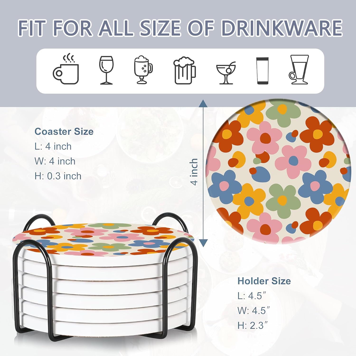 Drink Coasters Set of 6 with Holder, Vintage Groovy Flowers Absorbent Ceramic Drink Coaster for Tabletop Protection,Suitable for Kinds of Cups,Drinks Coasters for Home Office Decoration(4 Inches)