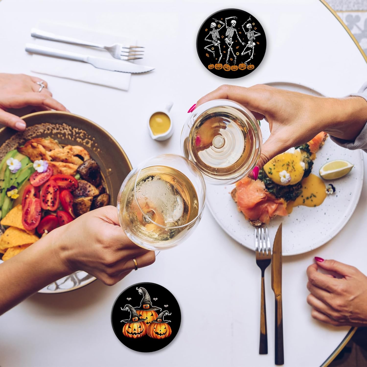 - Husiti Ceramic Coasters Set With Metal Holder: Keep Your Dining Table Stylish And Organized With This Set Of 6 4-Inch Round Coasters Featuring a Trendy Halloween Skeleton Skull Pumpkin Pattern.