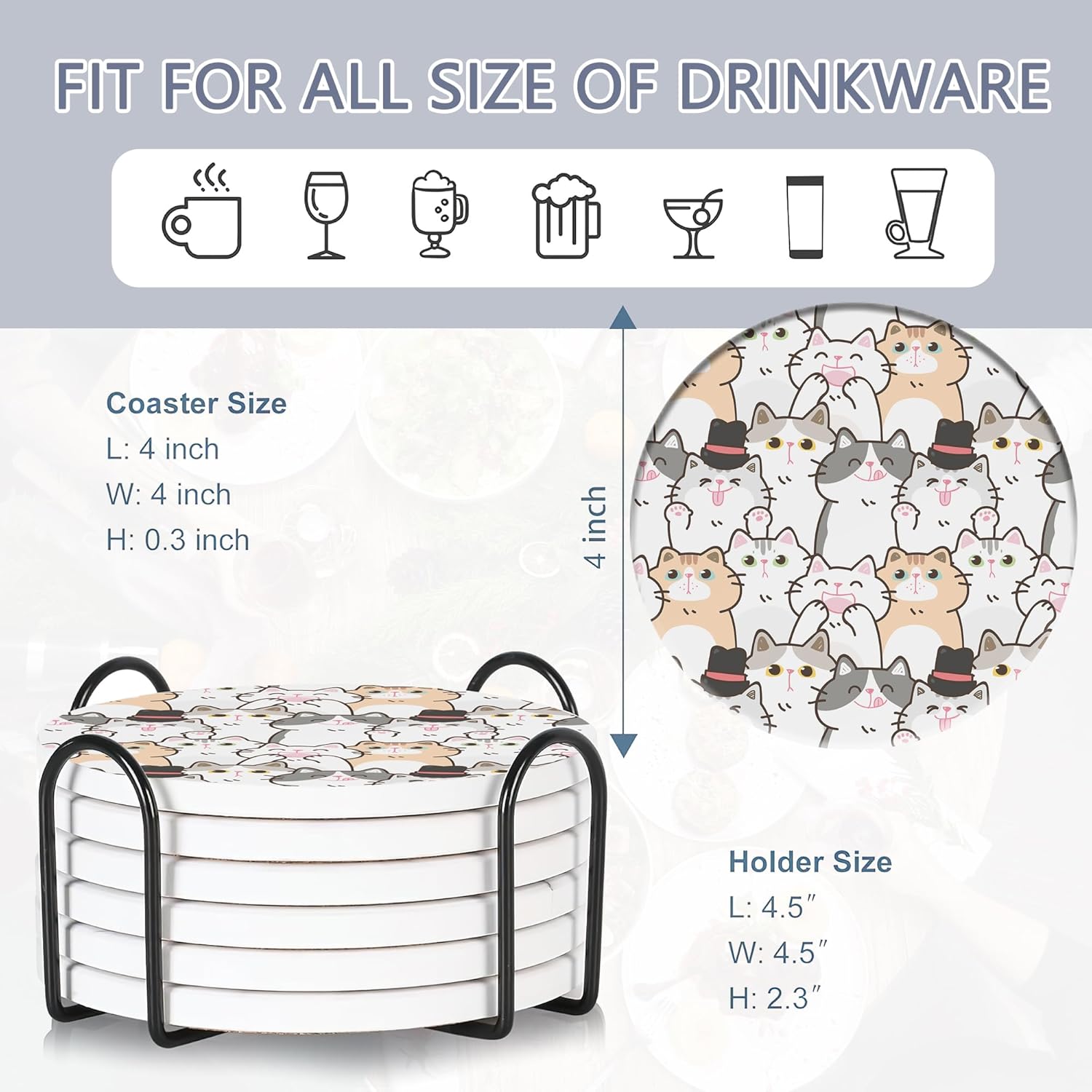 - Husiti Ceramic Coasters Set With Metal Holder: Keep Your Dining Table Stylish And Organized With This Set Of 6 4-Inch Round Coasters Featuring a Trendy Cute Cats Pattern.