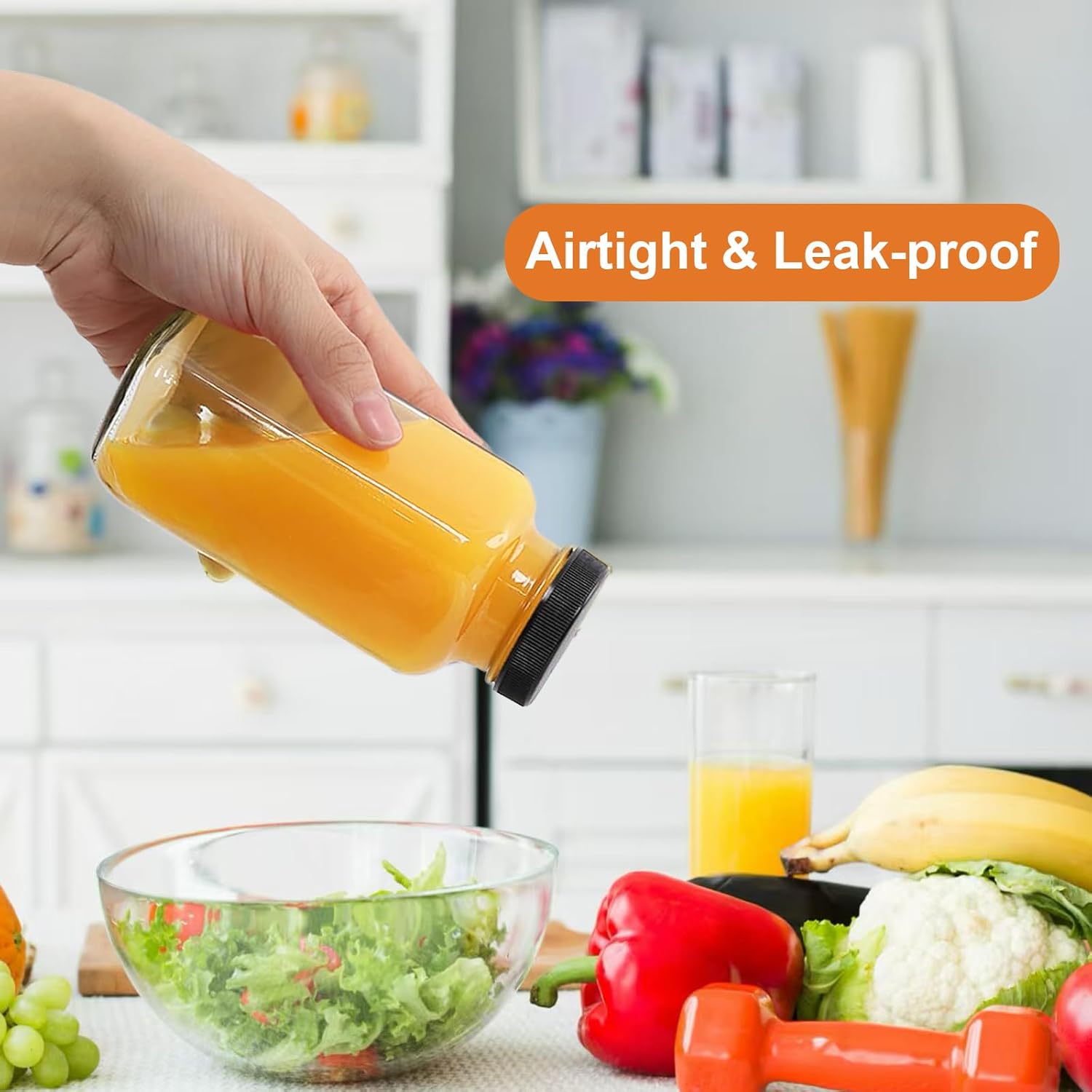 - Product Makings: Our water bottles are made of glass, beautiful and solid, reusable. Leak-proof Caps: The sealing gasket in the plastic lid provide a high closure to prevent liquid leakage. Glass juicing bottles with such caps are perfect for travel, parties, picnics,wedding, home & garden decor and more.