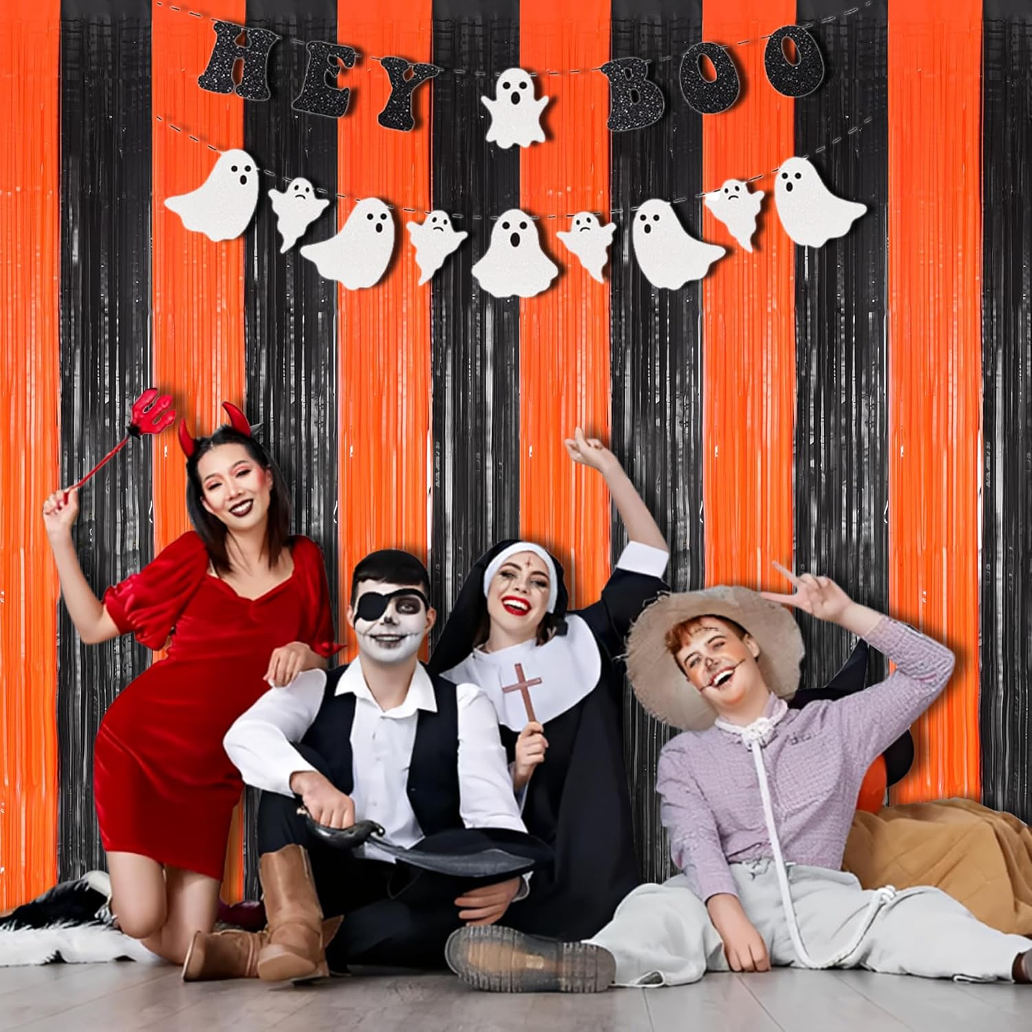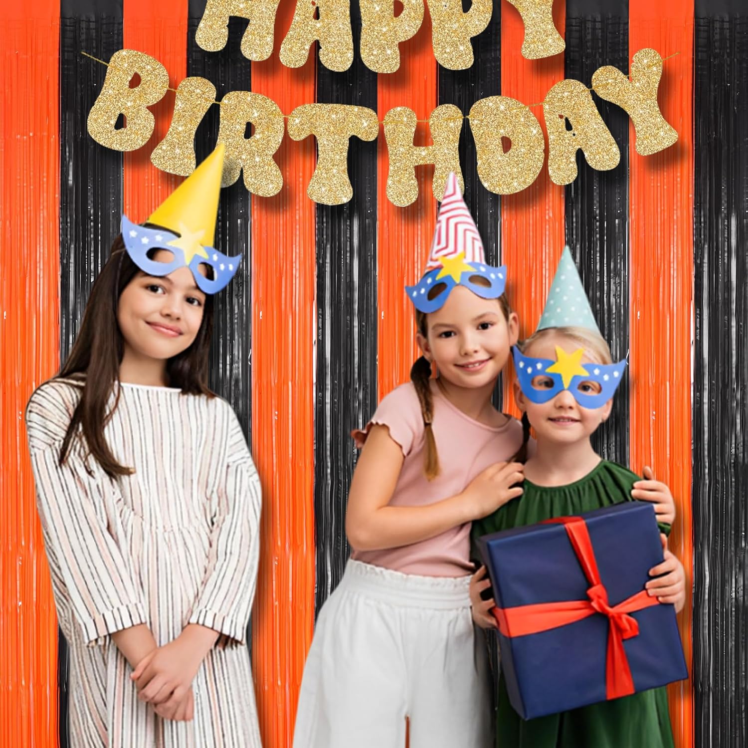 BRAVESHINE Tinsel Photo Backdrop Curtains - 2 Pack 3.2x8.2ft Black Orange Foil Fringe Streamer Curtain for Birthdays, Halloweens, Basketball, Pumpkins, Home, Indoor or Outdoor Party Decorations