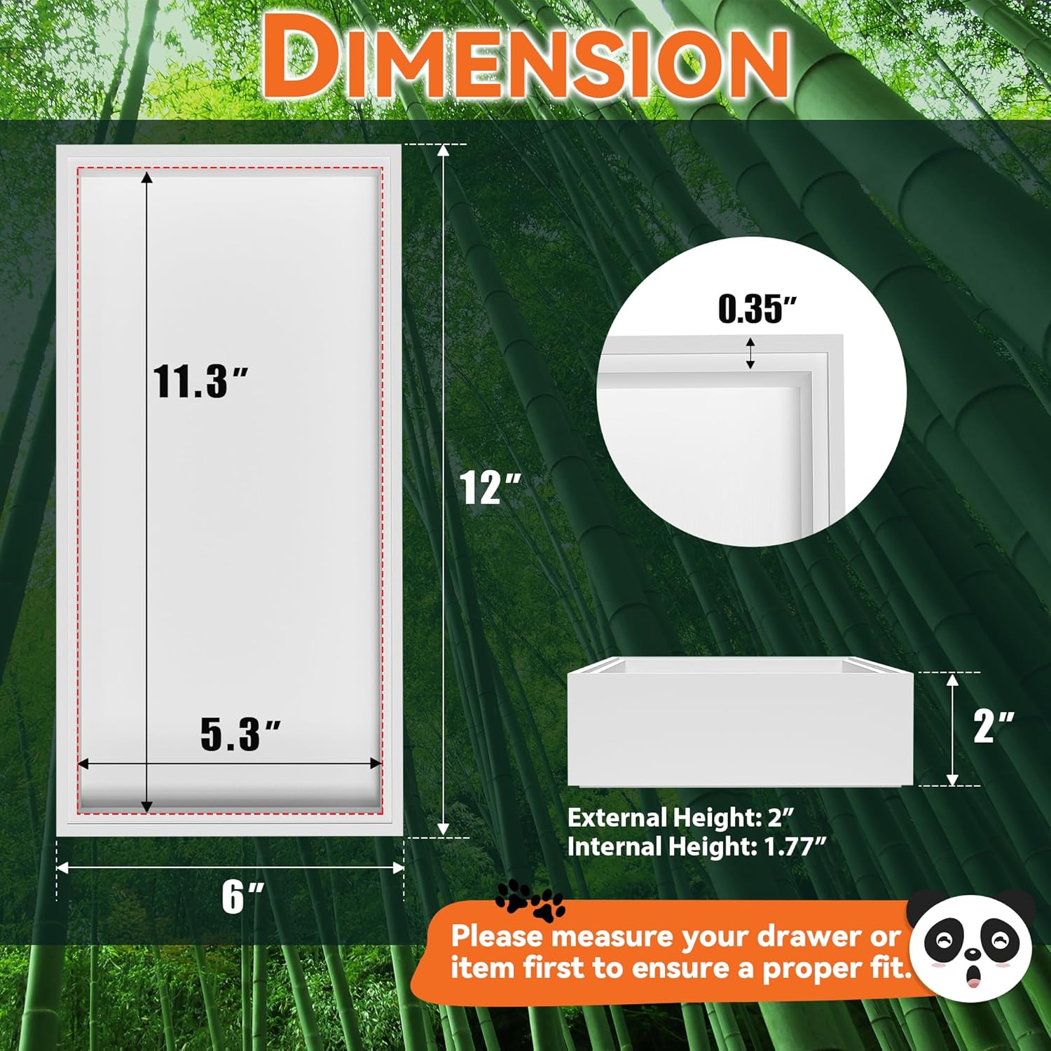 - Each bamboo drawer organizer measures: external size: 12" L x 6" W x 2" H; internal size: 11.3" L x 5.3" W x 1.77" H. Please check the size before purchasing