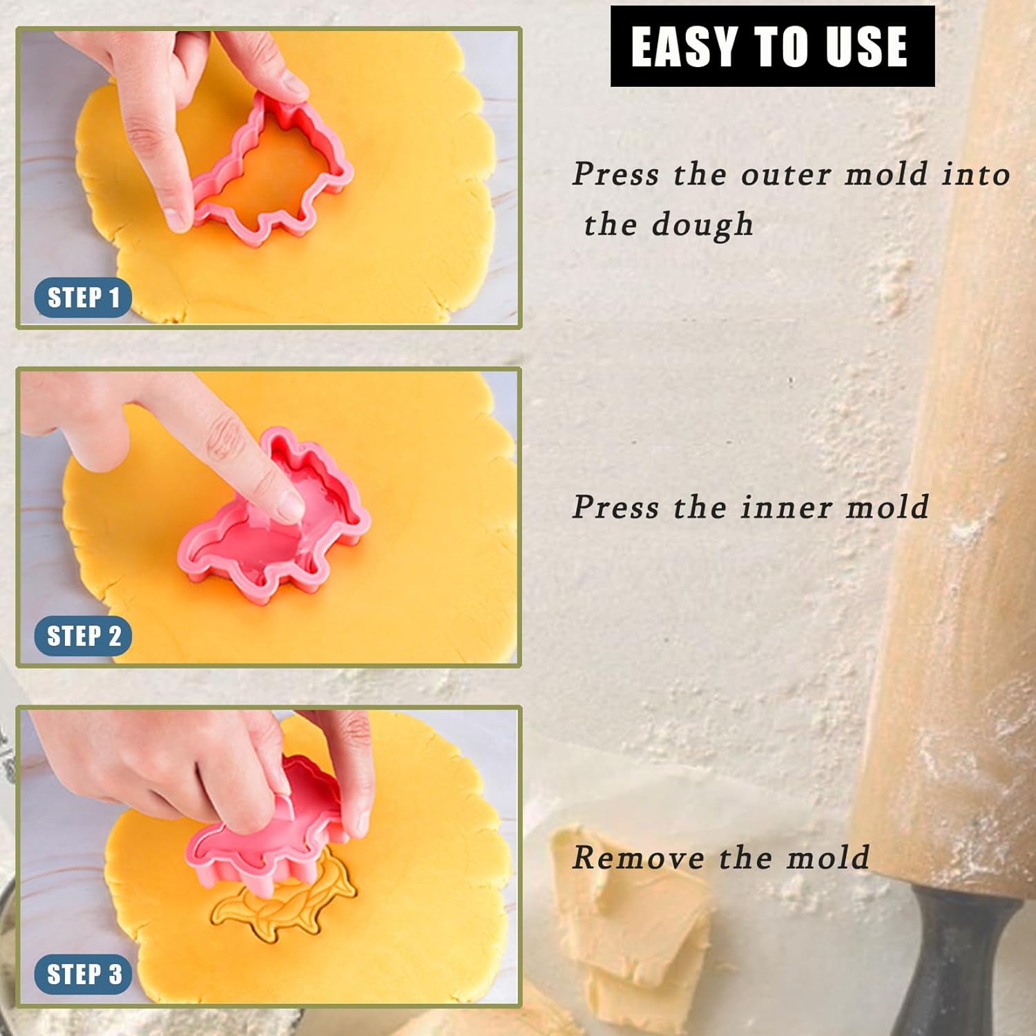 - ăDurable and Easy to UseăThe cookie molds can easily make 8 3D cookie shapes with just a light press. Both adults and children can operate it easily. In addition, the smooth surface ensures that food does not stick.And all the cookie cutters can be reusable and durable,no fading no deformation, long time service.Suitable for family baking and parent-child interaction, enhancing the fun of baking.