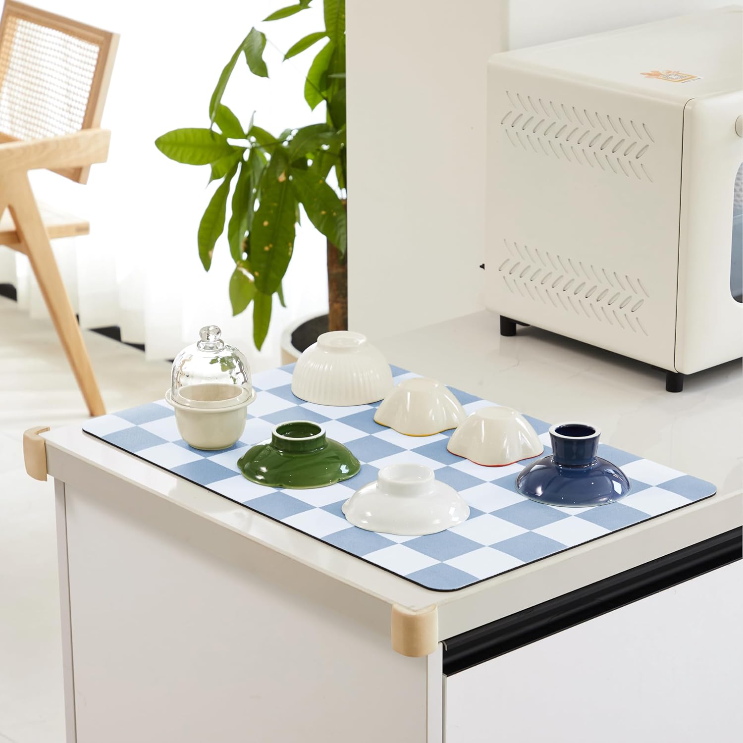 Checkered Dish Drying Mat for Kitchen Counter, Coffee Bar, Coffee Station Accessories, Retro Cute Aesthetic Modern Absorbent Drainer Mat Kitchen Drying Mat Easy Clean, Blue 16" x 24"
