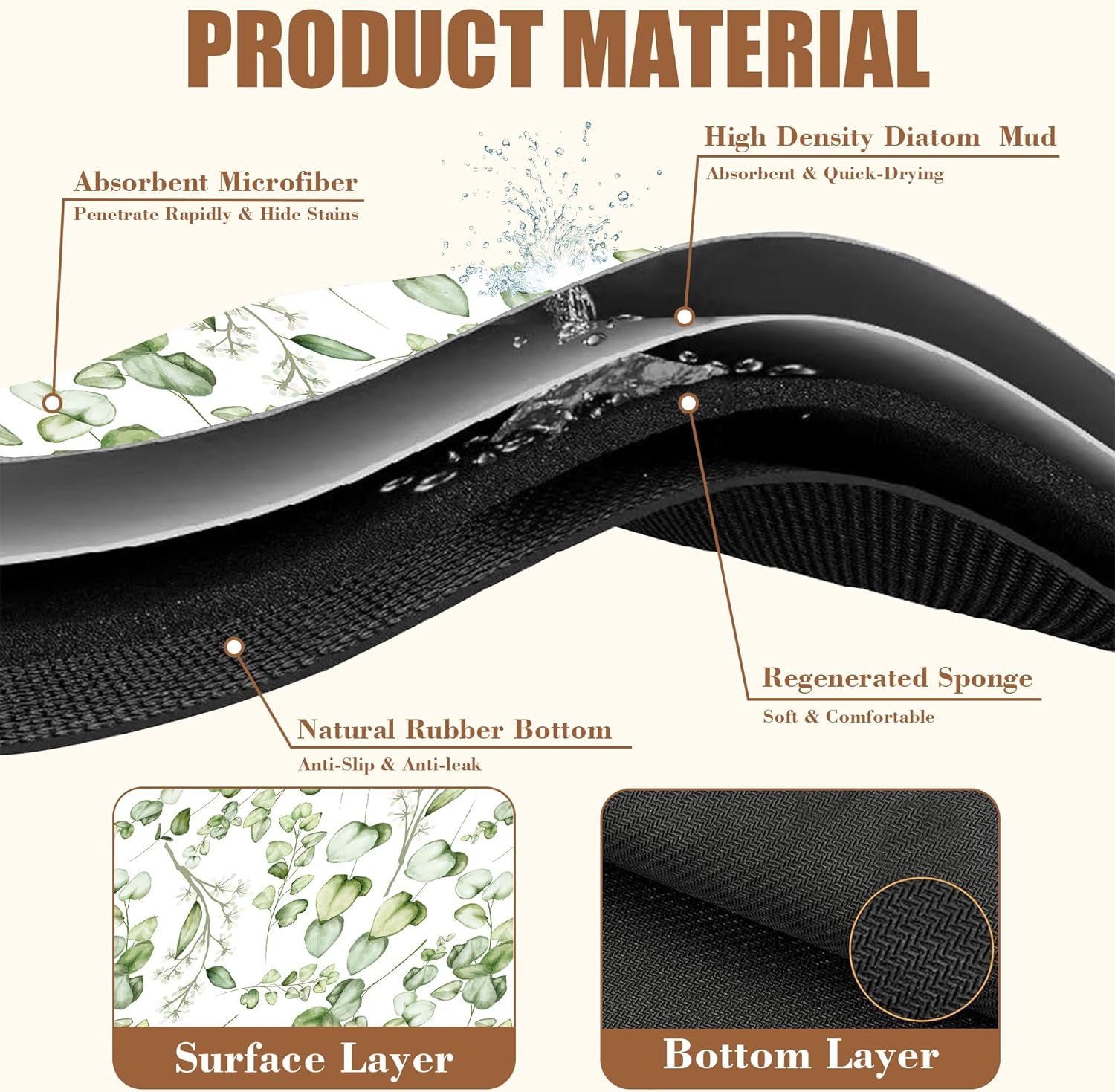 Eucalyptus Leaves Dish Drying Mat for Kitchen Counter Coffee Mat Hide Stain Absorbent Rubber Backed Drying Rack Pad Espresso Machine Coffee Bar Accessories 15.7 x 23.6 Inch