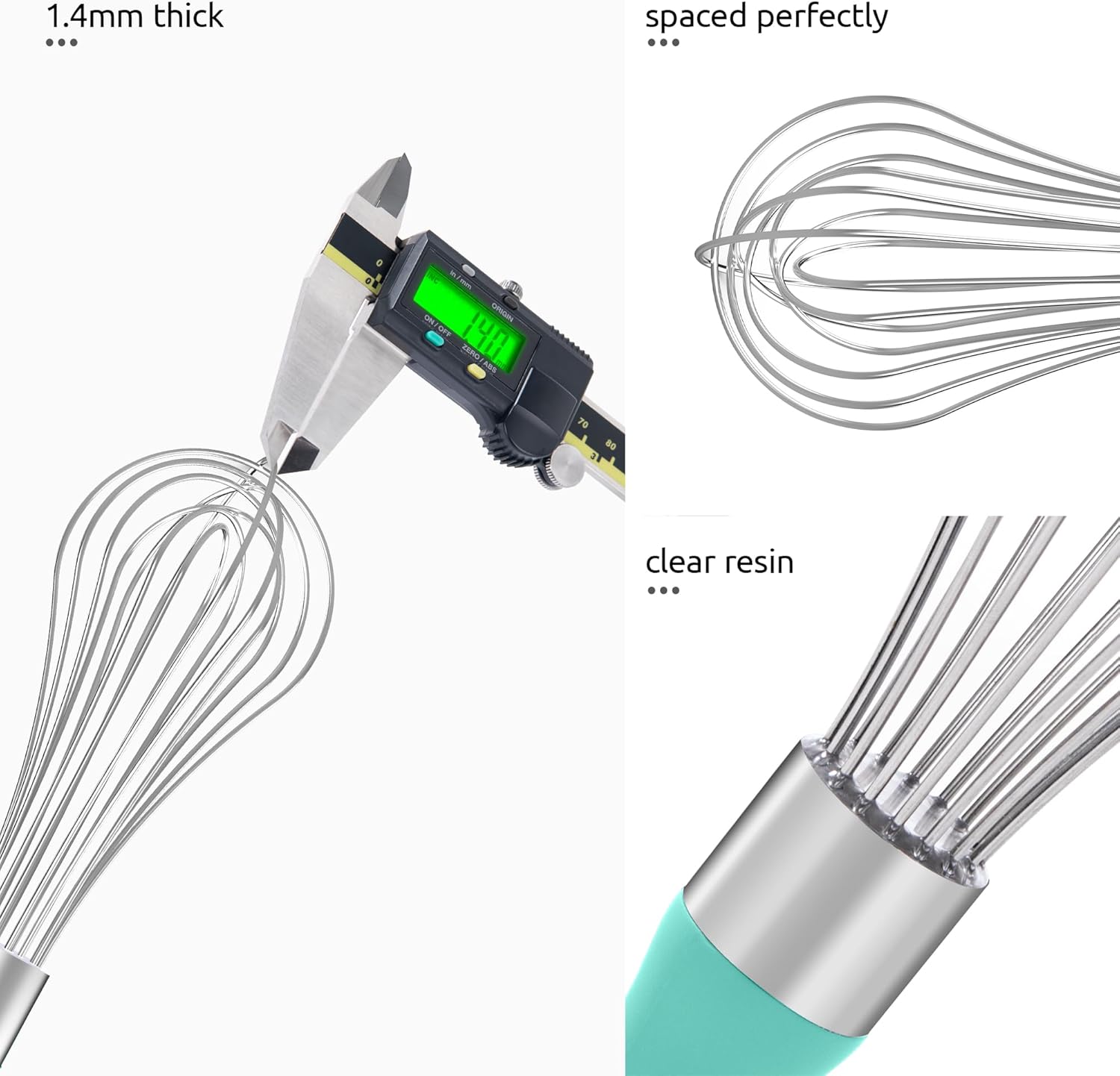- [8 High Flex Wires for Efficient Whisking] With 8 flexible wires and the high elastic 18/10 stainless steel material, this 8-wires cooking whisk has the right amount of flex to create that "whip" effect by adding more air to the mix. Wires are spaced perfectly for whipping and mixing and release anything holding on easily with just a quick rinse and scrub. It can whip up anything quickly and efficiently. 1.4mm thick wire has a right balance between strength and whisking efficiency.