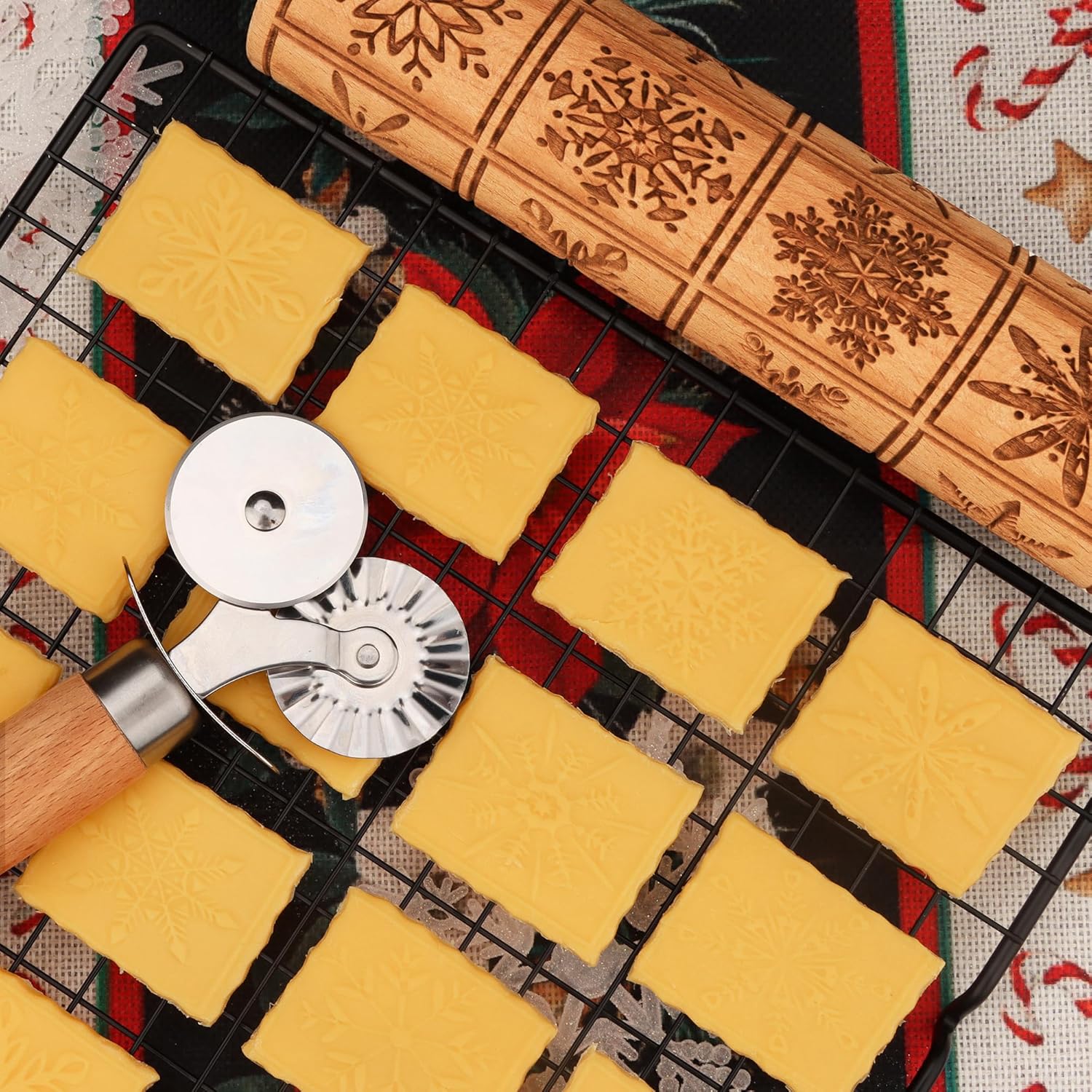 17" Premium Wood Rolling Pin with Snowflake Embossed Designs | 3mm Deep Springerle Cookie Molds | Christmas Rolling Pin & Baking Gifts for Women | Includes 3-in-1 Cleaning Brush