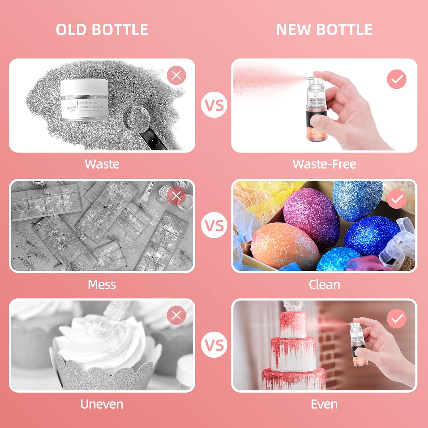 - SIMPLE TO USE - Edible glitter powder is pack in the Spray Pump Bottle, you could easily and precisely spray the luster powder to your projects. Brush dry onto your projects directly, or dilute it with vodka or oil-based flavorings to apply on food with a brush. Please do not mix it with water or it will be clumpy.