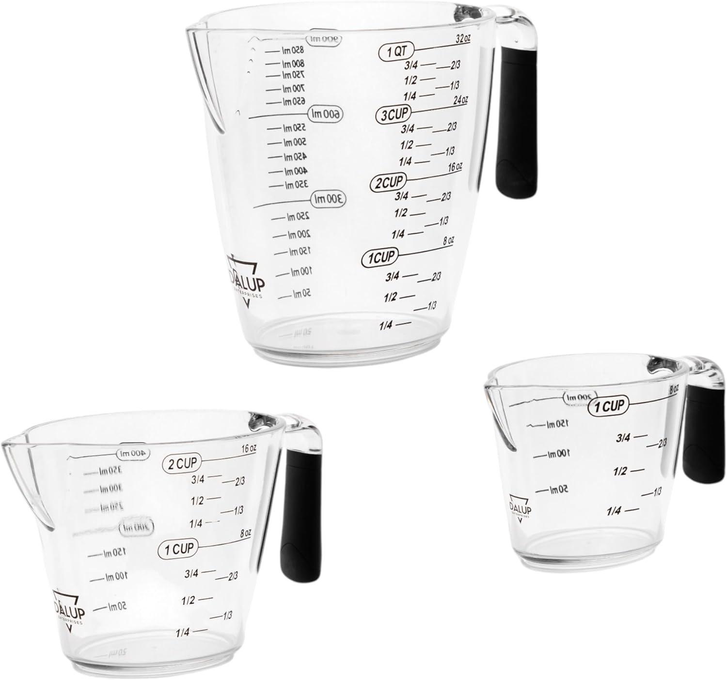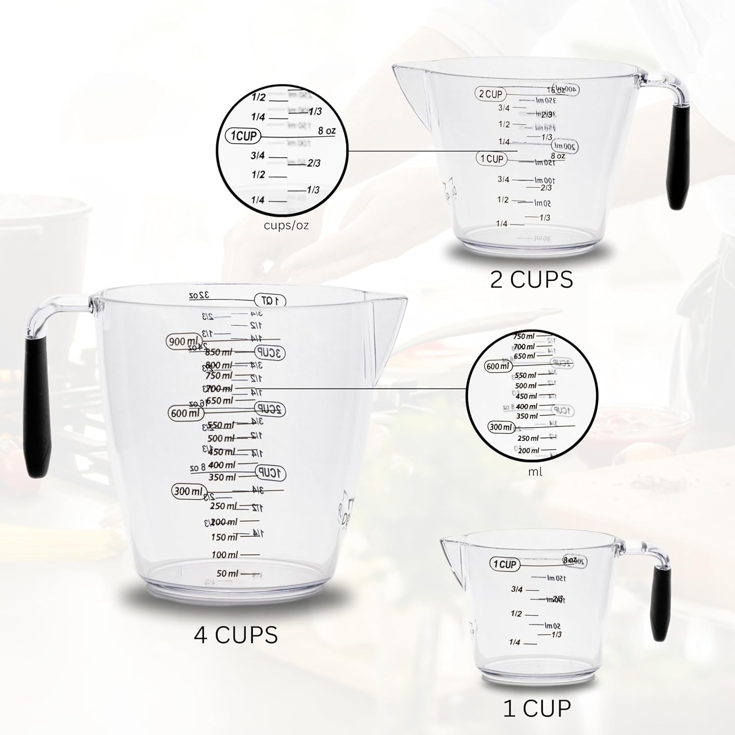 - Multiple Labels - Get accurate measurements and follow both imperial and metric recipes! These clear measuring cups have multiple labels, with cup and ounce on one side and milliliter on the other side.