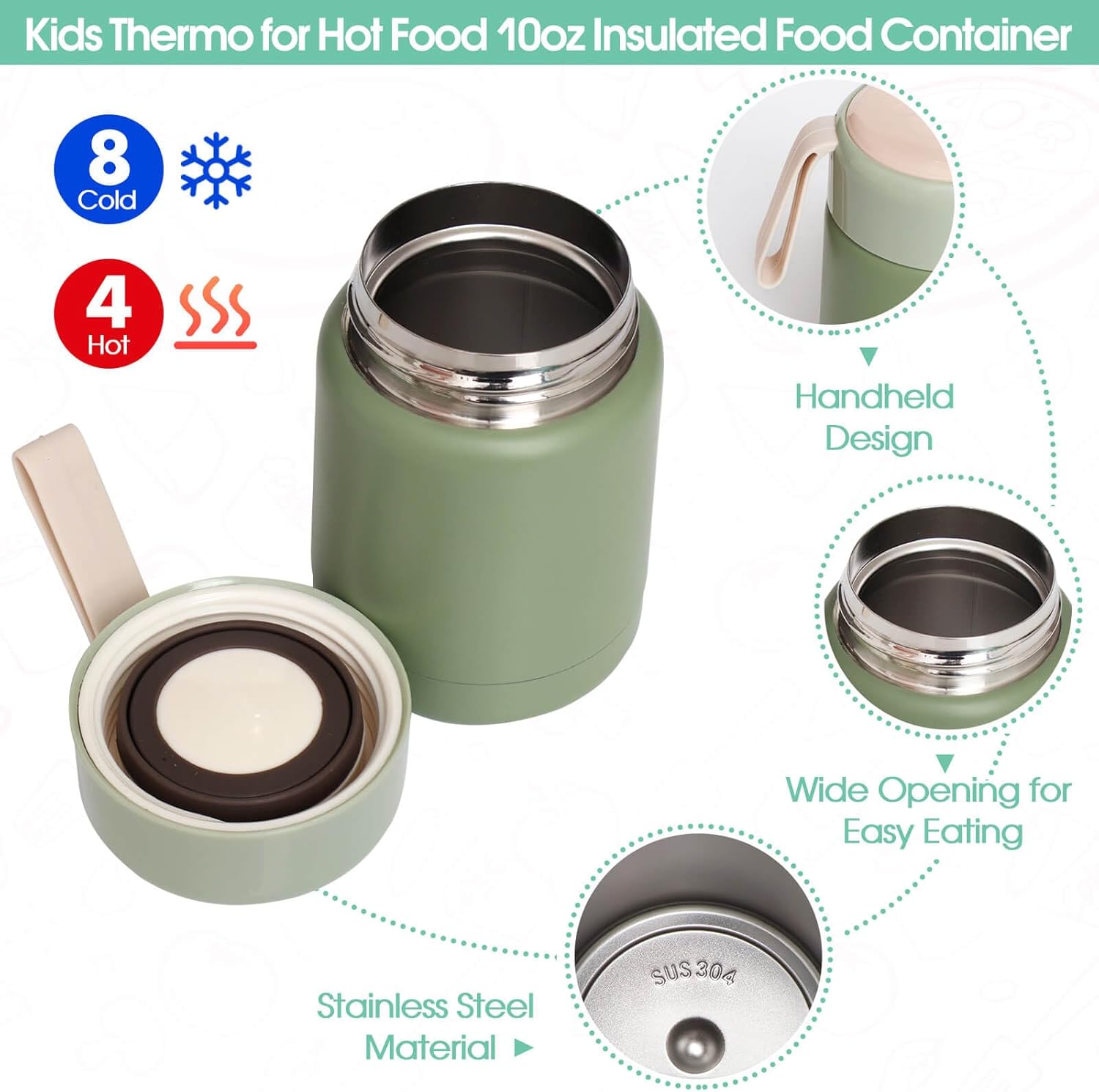 - The food thermos measures 3.3 x 5.1 inches and the insulated food jar has a 10 oz capacity, big enough to hold your delicious soup or beverage. The insulated food jar is made of food-grade 304 stainless steel, which has good heat insulation and cold preservation properties.