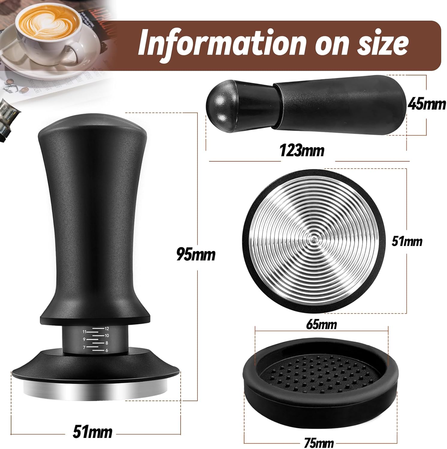 - Coffee Set with Built-in spring and Scale: This set includes a 51mm coffee press, a black six-pin cloth powder dispenser and a black silicone pad. More complete than most sets on the market, no need to buy additional accessories. Our coffee masher features an innovative design with a built-in spring, the pressure will automatically rebound without additional adjustments; the coffee masher is marked with an eye-catching scale for the same mashing result every time.